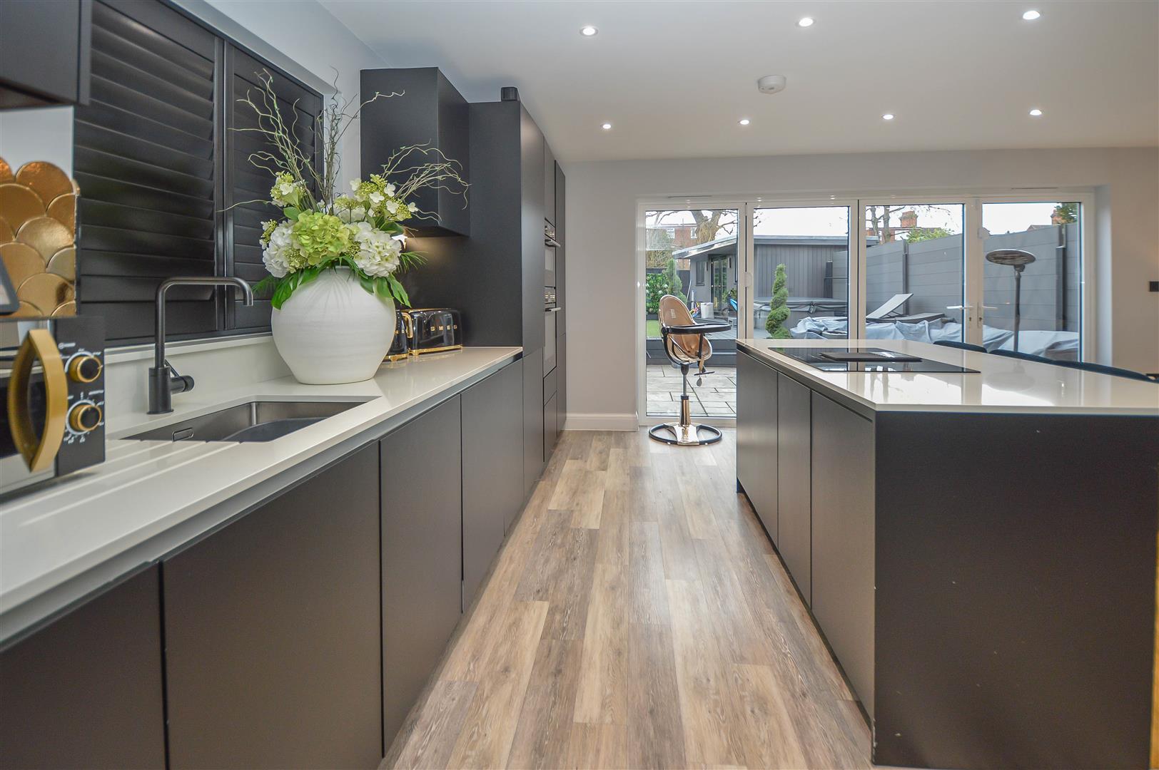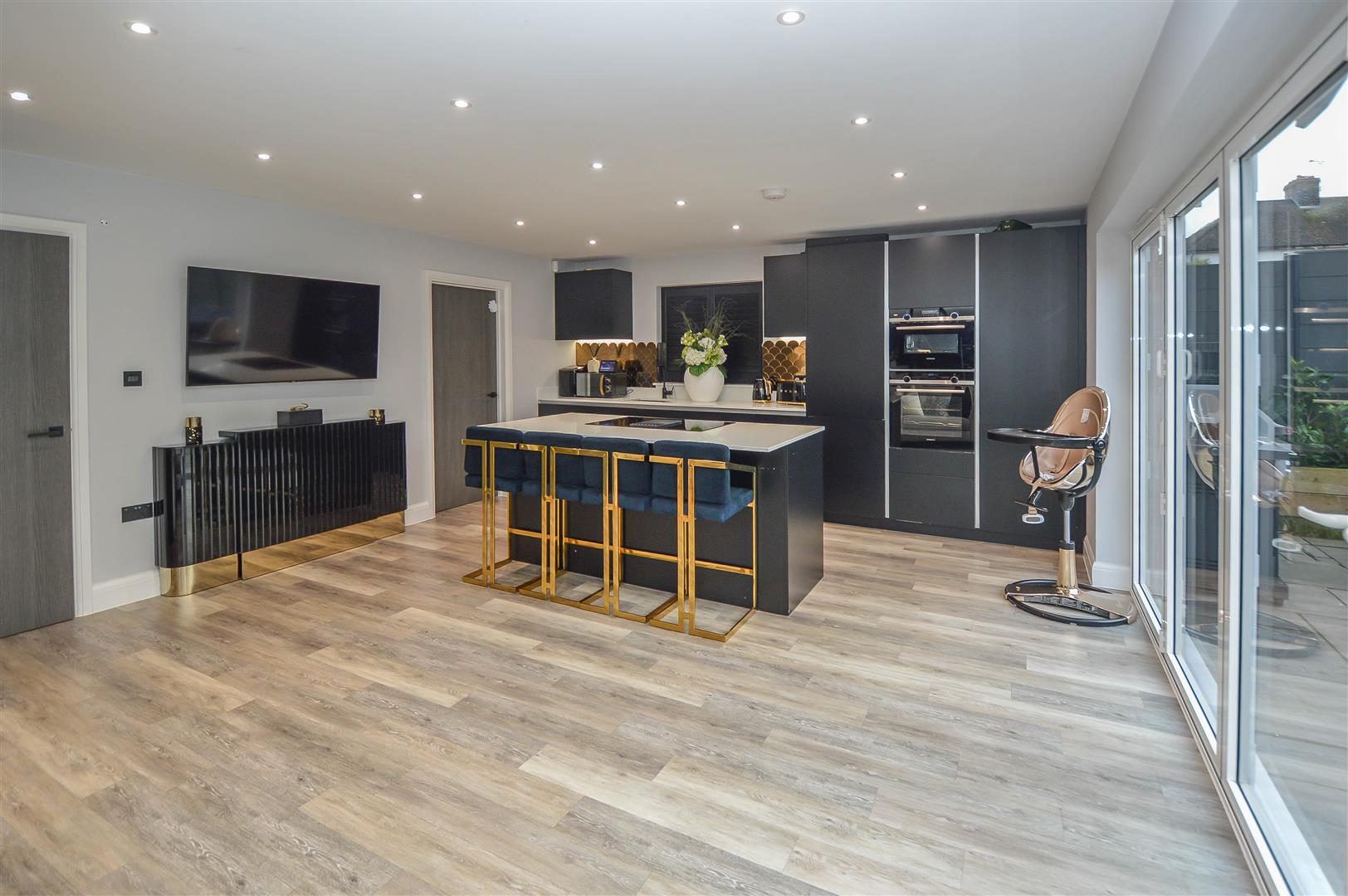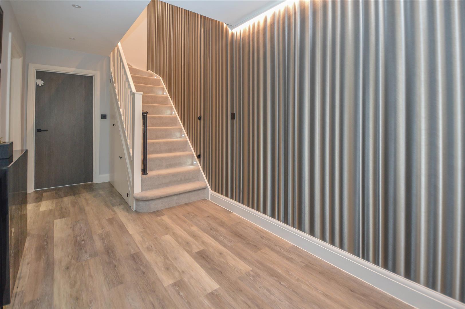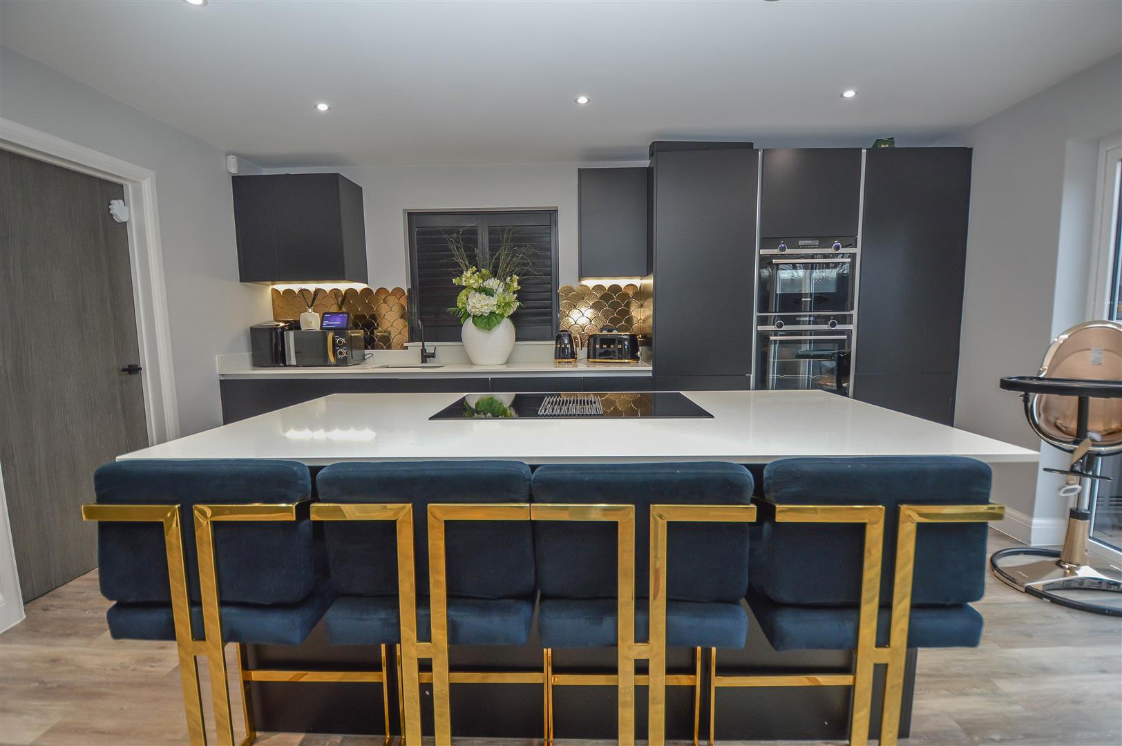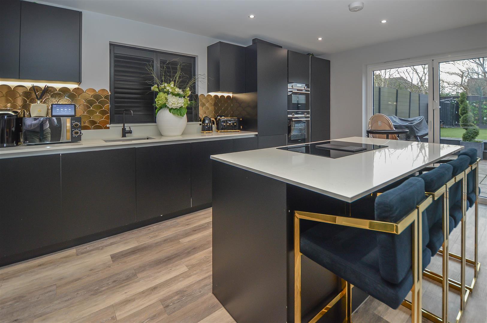 The internal layout begins with a grand and welcoming entrance hall, setting the tone for the elegance that flows throughout the home. To the front, a beautifully designed lounge offers a sophisticated yet cosy retreat, perfect for relaxation. To the rear, a breathtaking open-plan kitchen and dining area showcases high-spec integrated appliances, a stylish breakfast bar, and ample space for a dining suite or lounge furniture. Expansive bifold doors seamlessly extend the living space into the rear garden, creating the ultimate indoor-outdoor entertaining experience. A separate utility room enhances practicality, while a sleek ground-floor cloakroom completes this level.