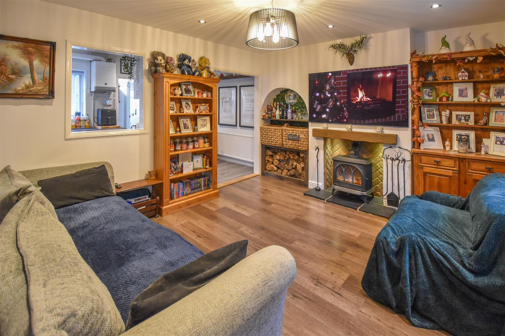 Living Room - 4.27m x 3.66m (14' x 12') - Window to front aspect. Feature fireplace with lob burning stove. Wood store adjacent. Serving hatch to kitchen. Open through to :