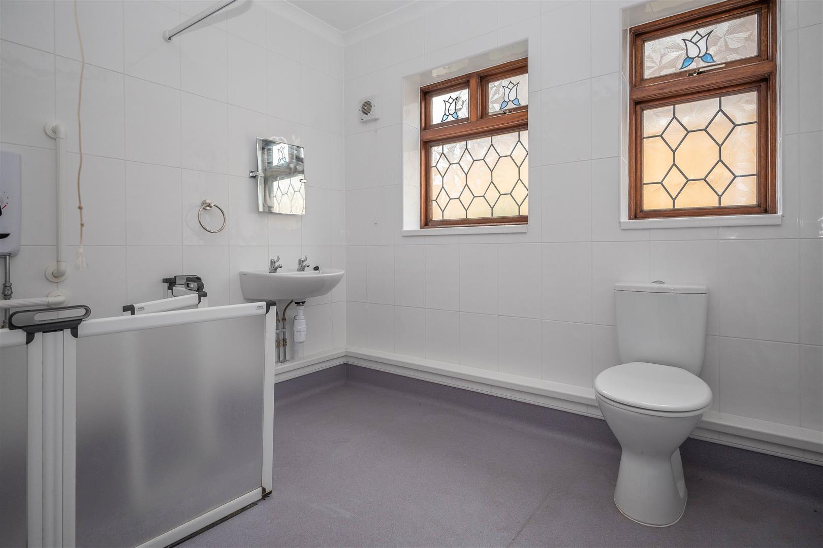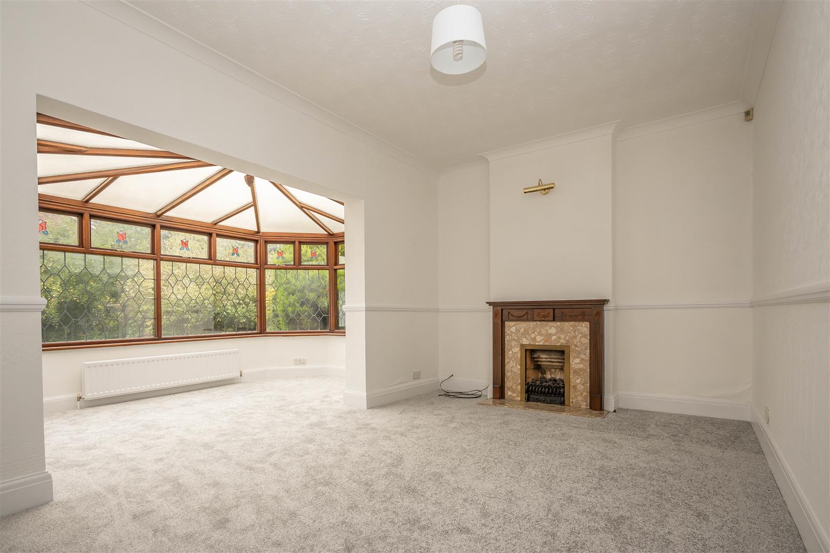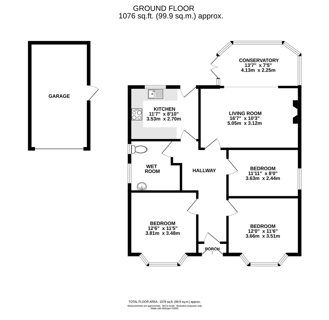 To the rear, a well-appointed kitchen is fitted with a range of eye and base-level units, offering ample worktop space and direct access to the garden. The bright and inviting living room, complete with a feature fireplace, flows effortlessly into the conservatory. From here, French doors open onto the rear garden, providing delightful views and an ideal space for relaxation or entertaining. A spacious wet room completes the internal layout.