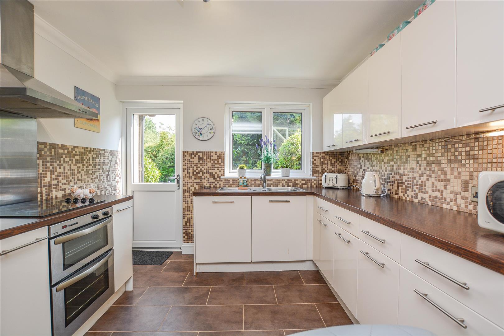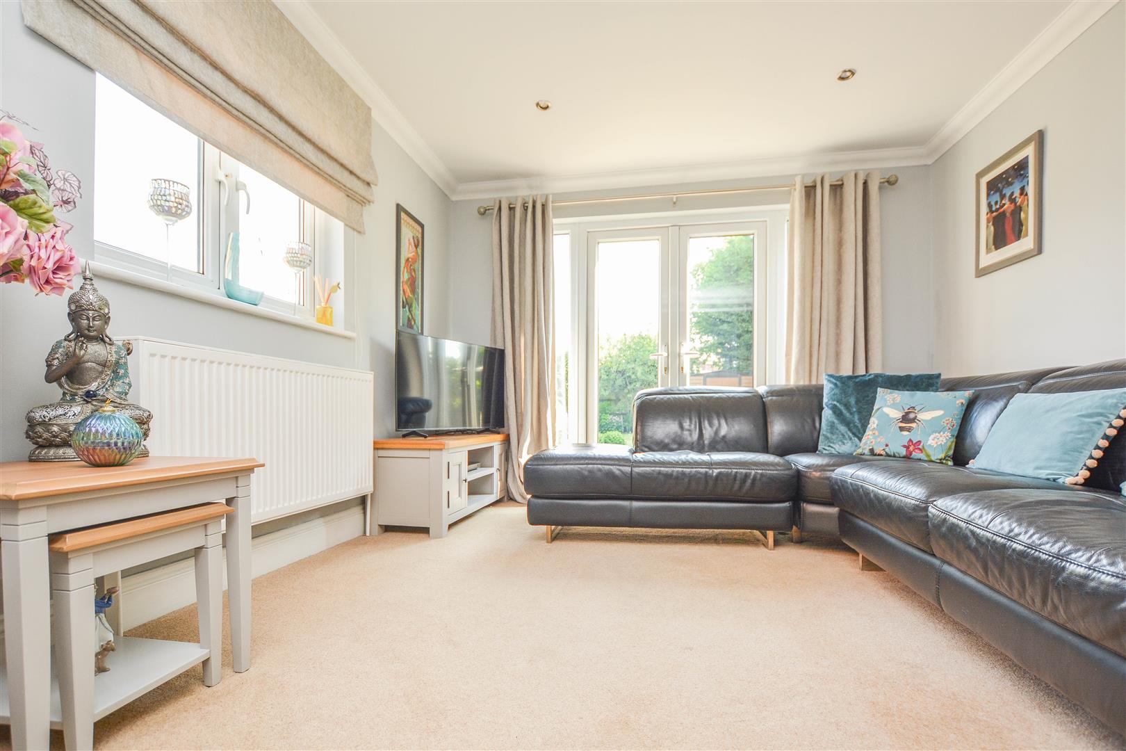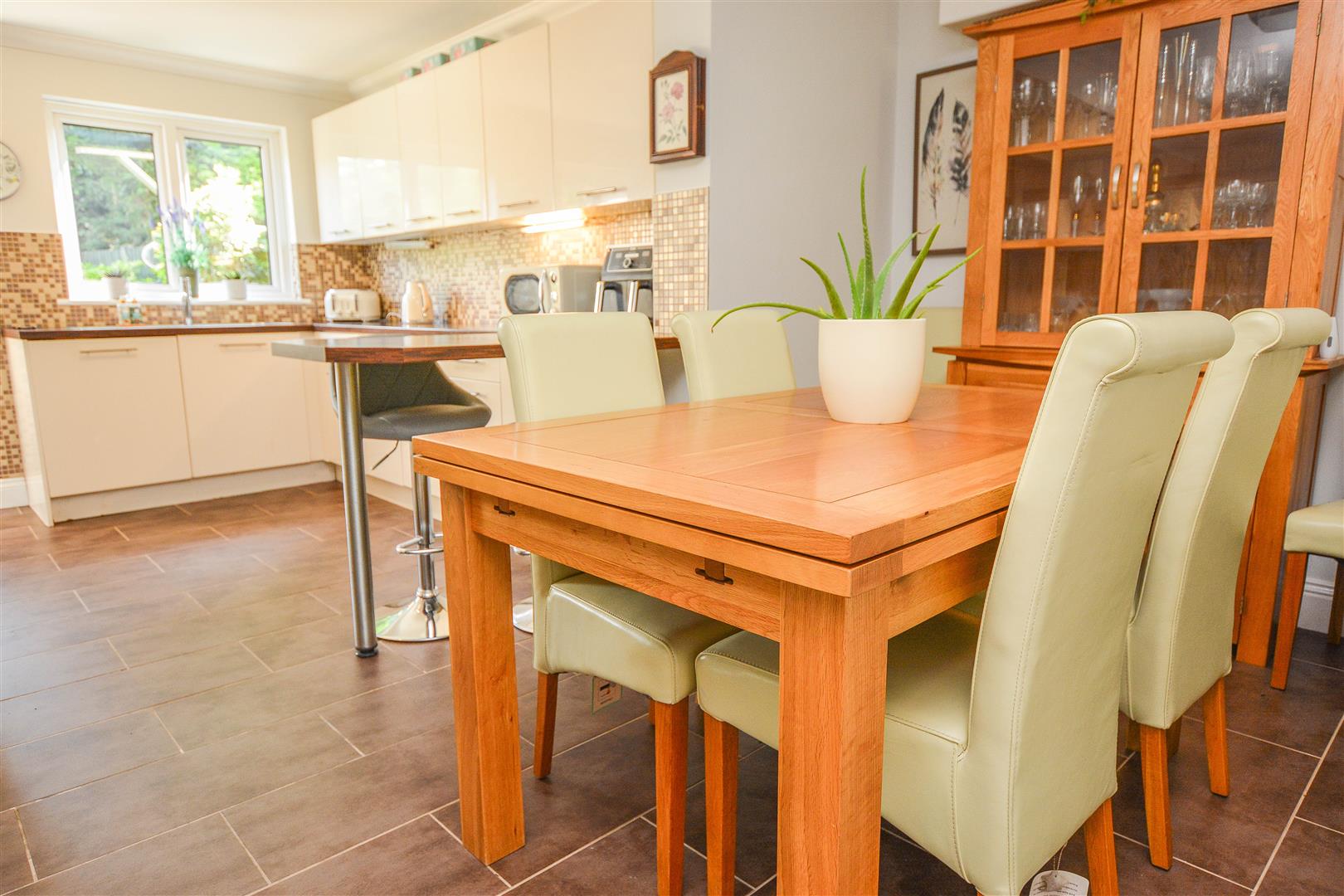 The internal layout begins with a bright and welcoming entrance hall, leading into a spacious living room featuring dual-aspect windows, a wood-burning stove, and French doors that open onto the rear garden. Flowing seamlessly into the kitchen and dining area, the well-appointed kitchen is fitted with sleek eye and base units, generous worktop space, and offers direct access to the garden.