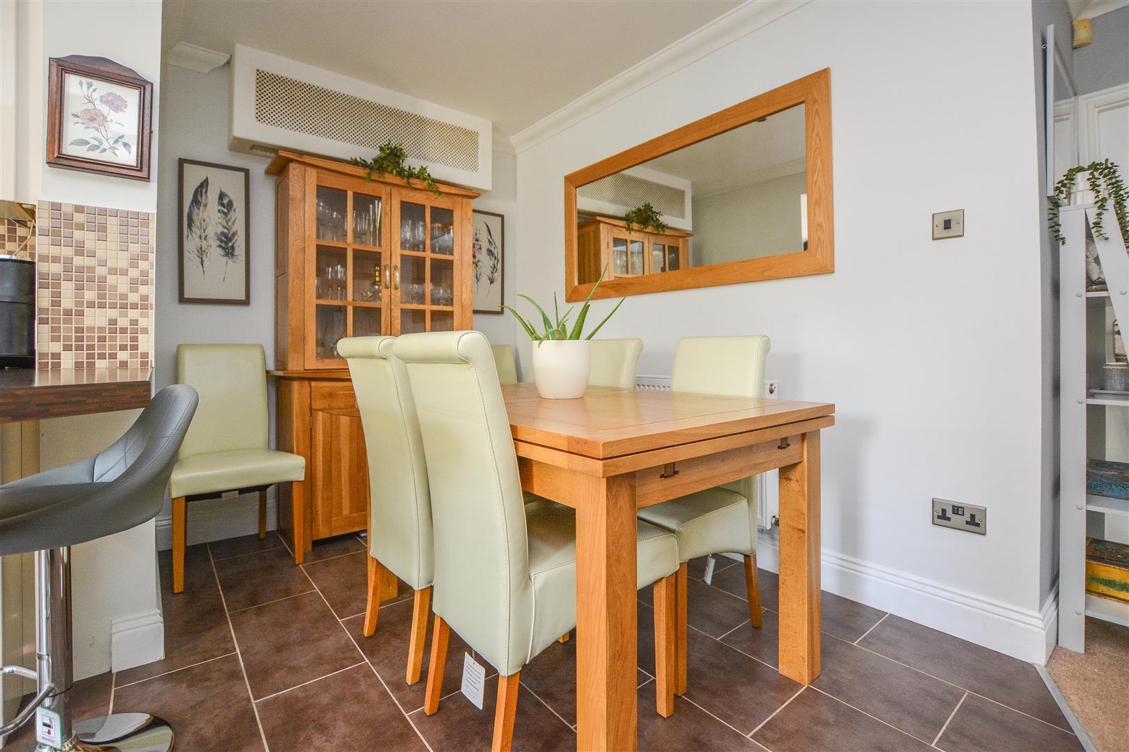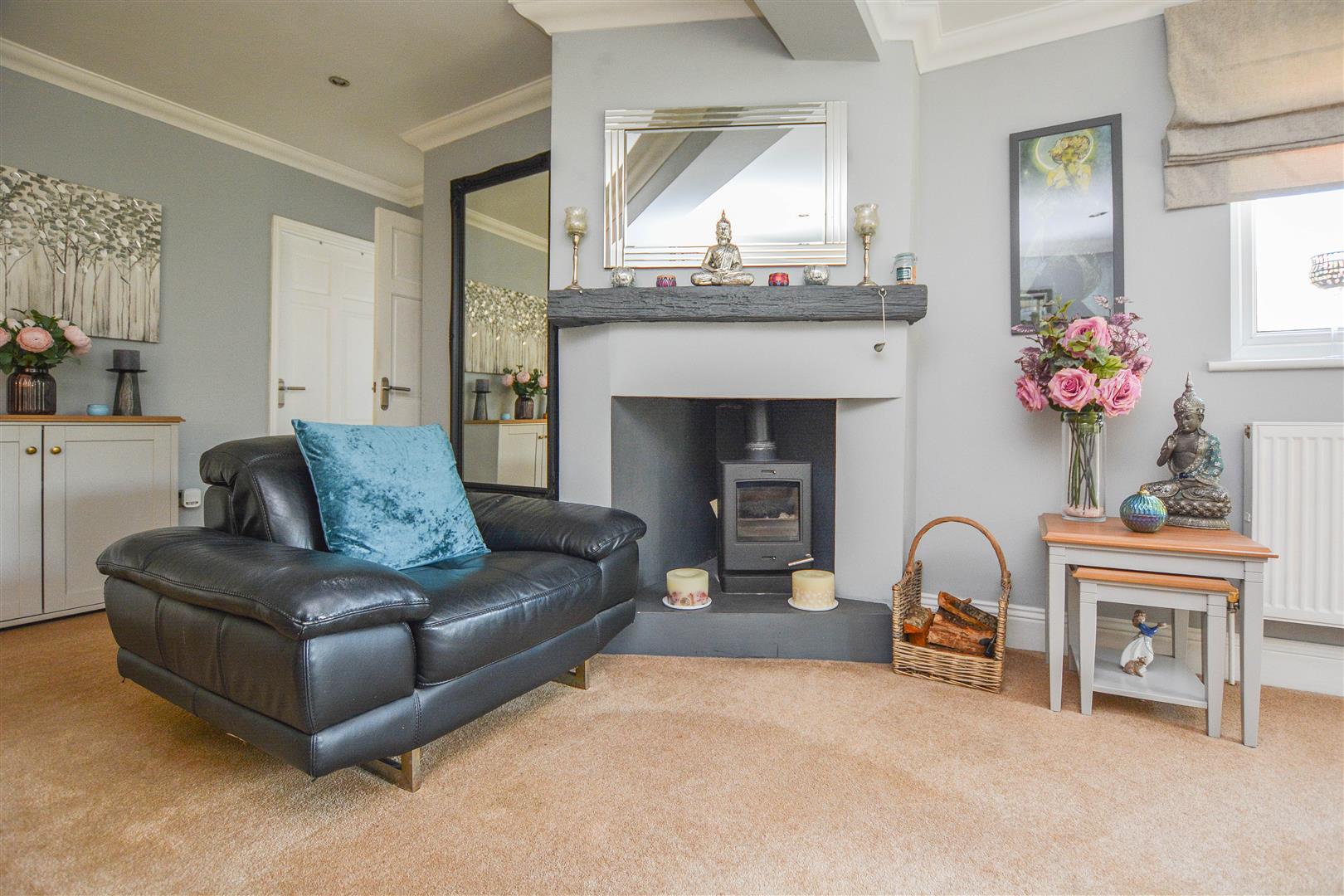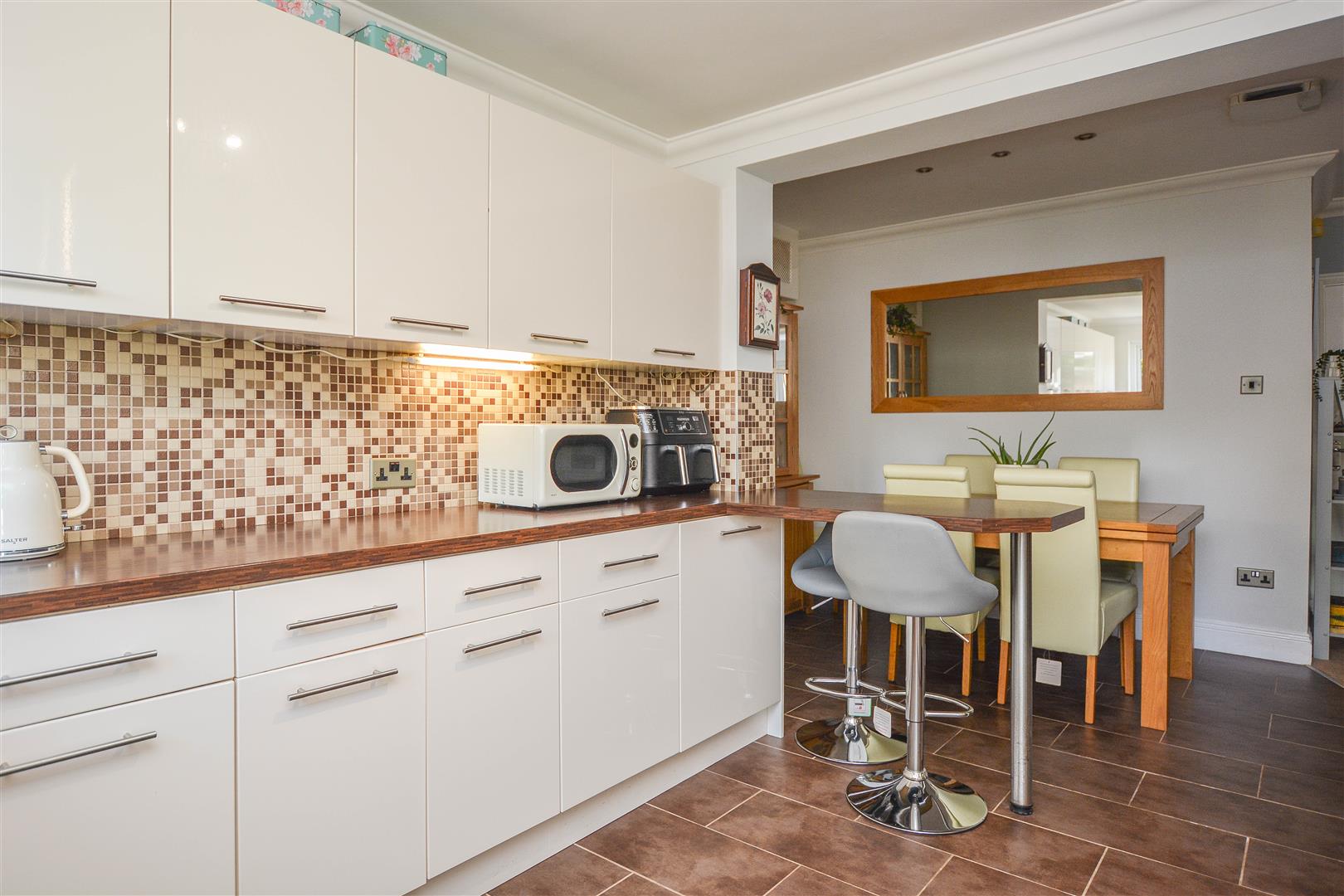 The internal layout begins with a bright and welcoming entrance hall, leading into a spacious living room featuring dual-aspect windows, a wood-burning stove, and French doors that open onto the rear garden. Flowing seamlessly into the kitchen and dining area, the well-appointed kitchen is fitted with sleek eye and base units, generous worktop space, and offers direct access to the garden.