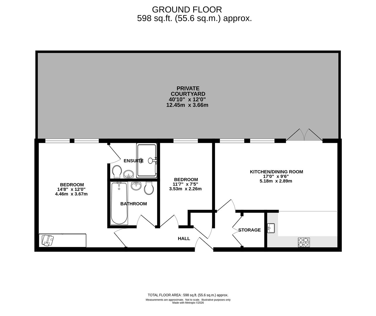 Kitchen / Diner / Living Room - 5.18m x 2.90m (17' x 9'6) - Two windows overlooking the courtyard garden, plus access into the garden via a set of French doors. Modern fitted wall and base units with under cupboard lighting. Integrated oven and hob with extractor above, fridge/freezer and microwave.