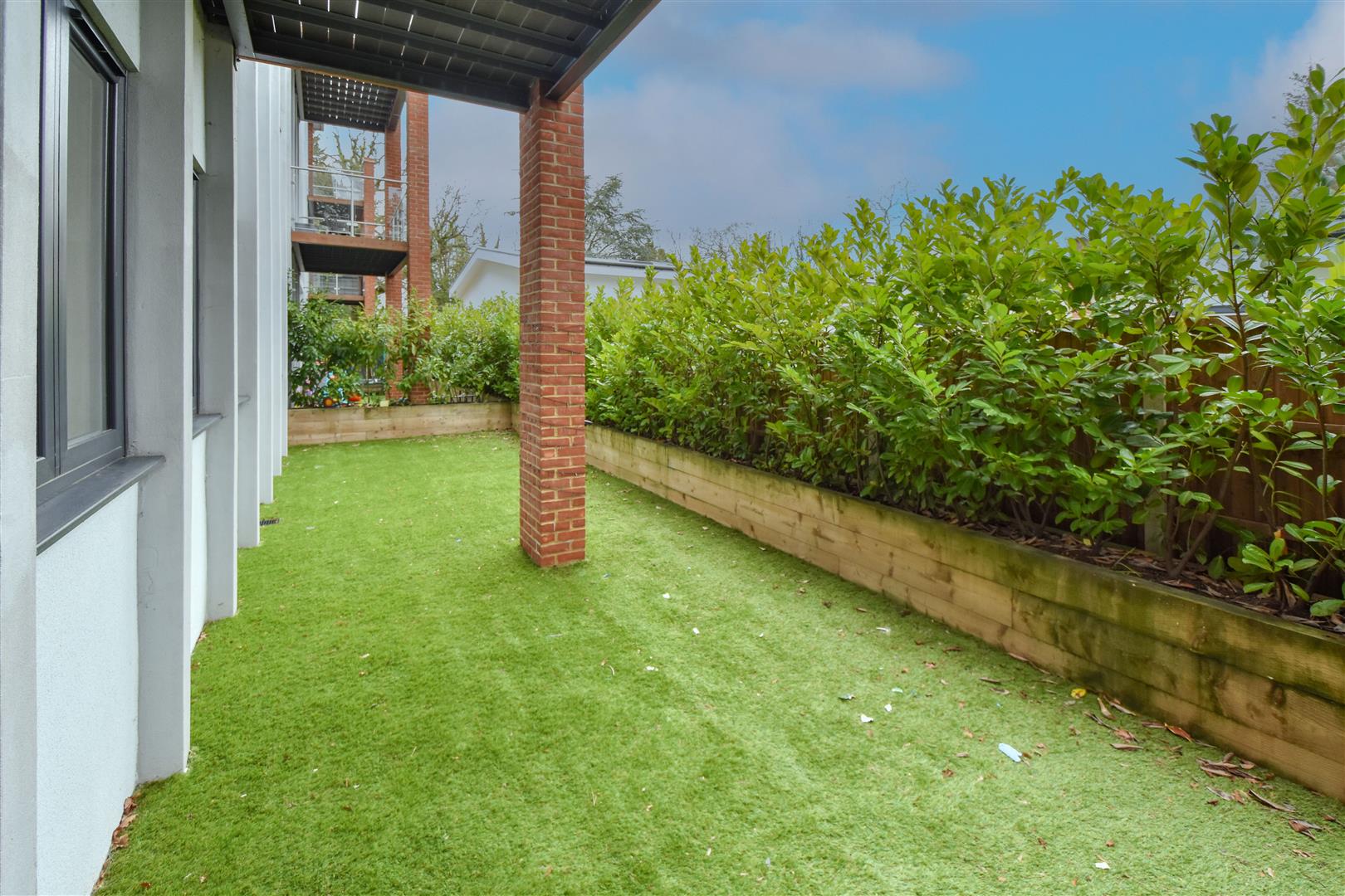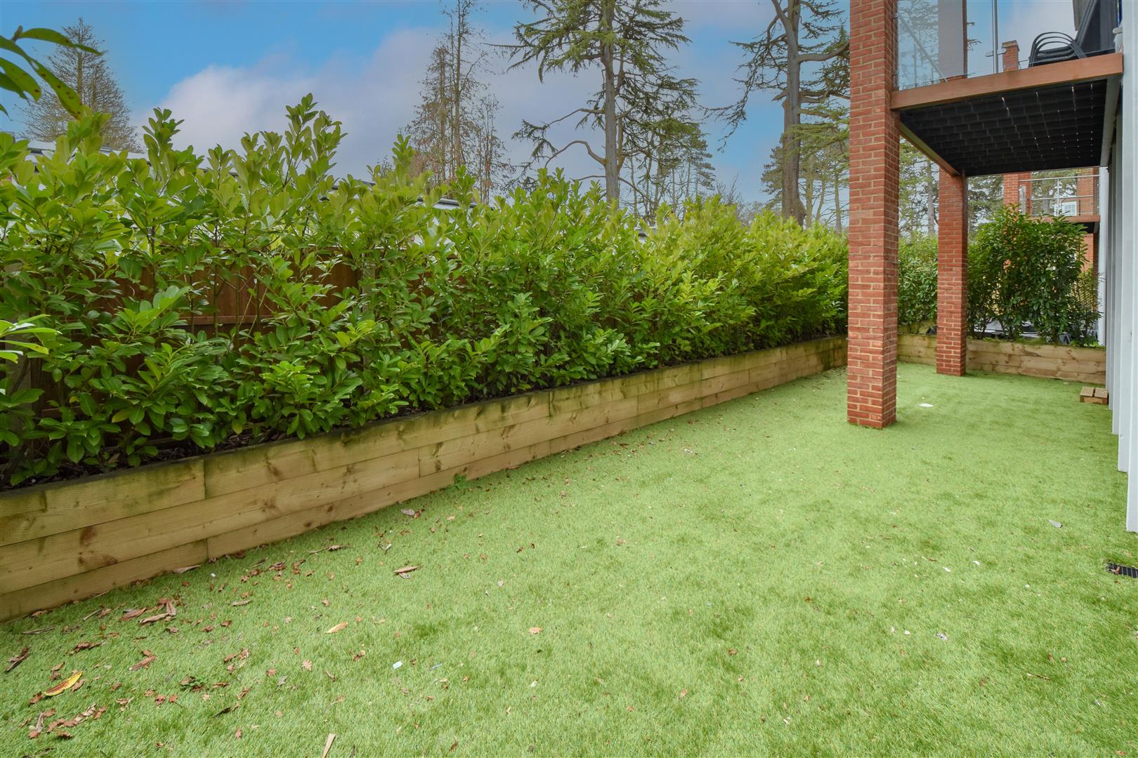 Private Courtyard - 12.45m x 3.66m (40'10 x 12') - Artificial lawn. Raised flowerbeds with screening laurels to front.