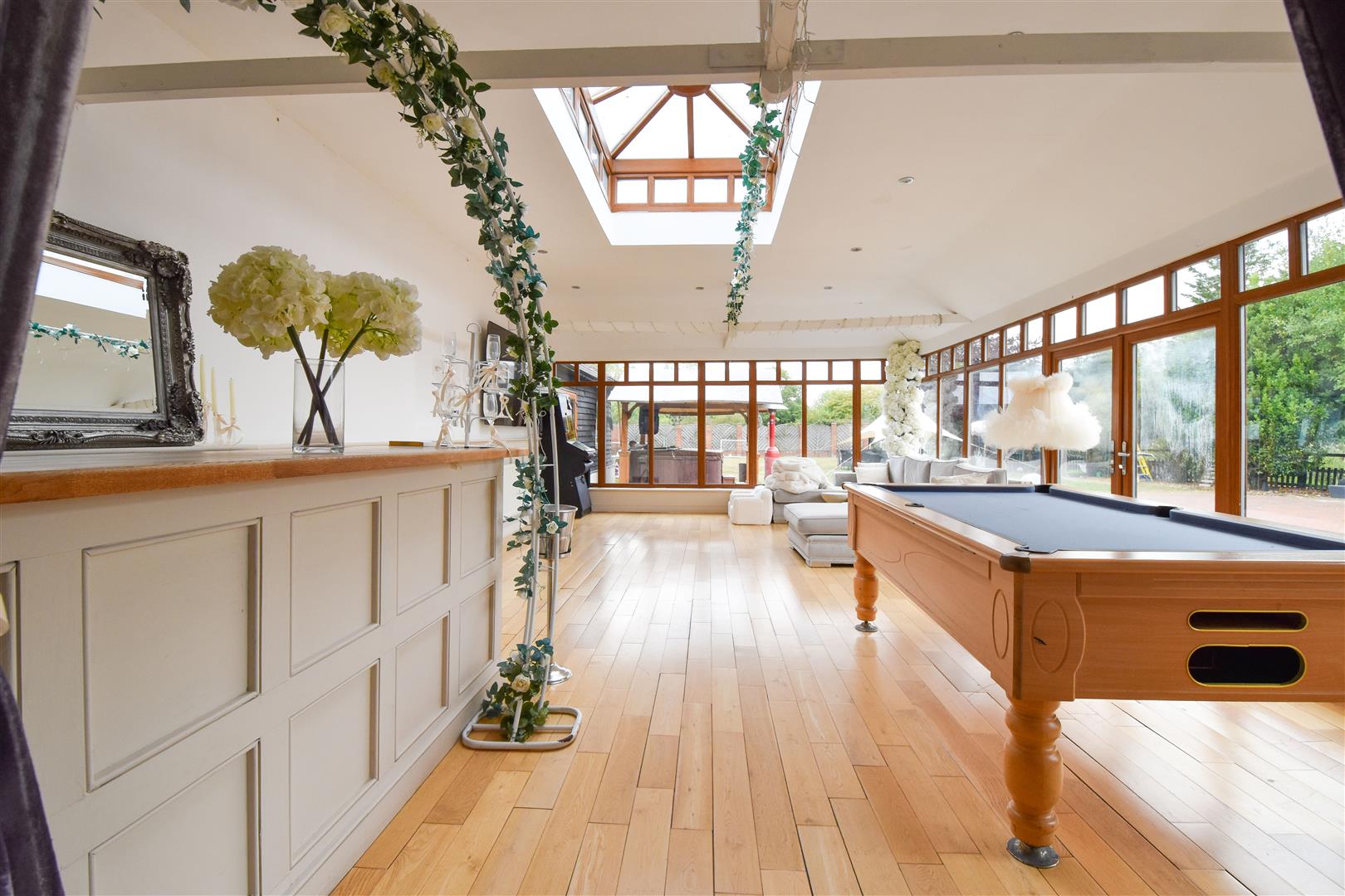 Games Room - 8.94m x 5.59m (29'4 x 18'4) - French doors opening onto garden. Windows two two sides. Lantern roof light. Bar area with seating.