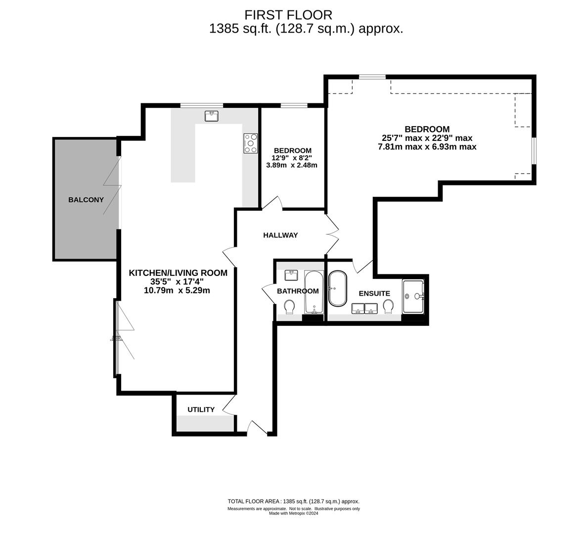 A kitchen / living room, measuring an impressive 35'5 in length x 17'4 has two sets of bi-folding doors, one set opening to a 'Juliette' balcony and the other onto a private balcony which is of good size. The kitchen area is fitted in a range of quality 'Crabtree & Hargreeves' wall and base units with breakfast bar with seating to one side. Integrated appliances include fridge/freezer, integrated ovens and microwave and induction hob with extractor above. There is further space for a washing machine and tumble dryer in a separate utility off the hallway.