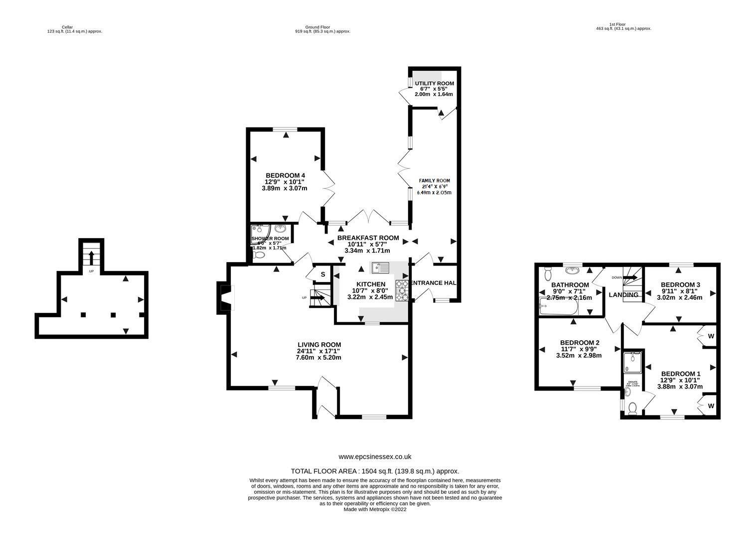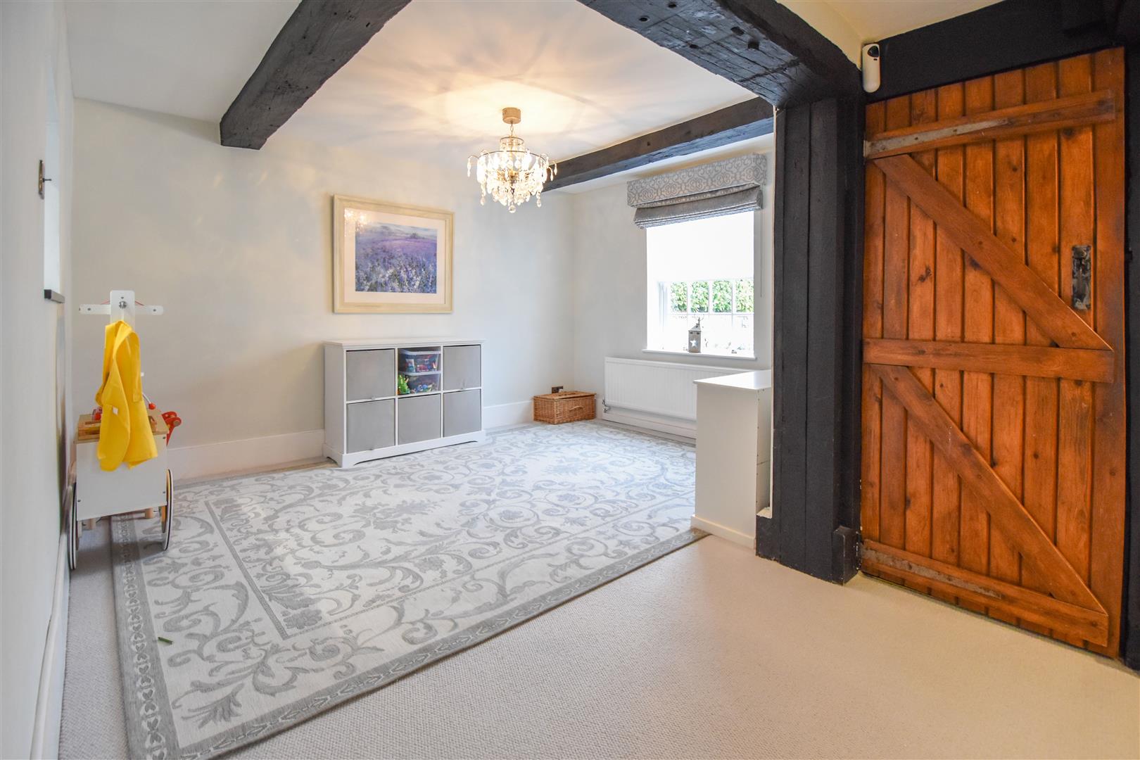 A spacious entrance porch to the side of the property offers an excellent space for boot store, coats etc, there is a wooden door which gives access into a large family room which is open plan to the breakfast room. The family room, breakfast room and kitchen have a flagstone tiled floor with electric underfloor heating. There is access into the garden via French doors from both the breakfast room and the family room. The kitchen which is open plan to the breakfast room has been fitted in a modern range of high gloss wall and base units with granite work surface over and there is ample space for appliances including a Range style cooker. Further space and plumbing is available in a separate utility which is off the family room, this room also has access into the rear garden. Located at the front of the property is a large L-shaped lounge with a log burning stove set into a redbrick fireplace as a lovely focal point, and there are stairs which rise to the first-floor level. An interesting feature of the property is that it has a cellar which can be accessed via steps from the ground floor shower room.