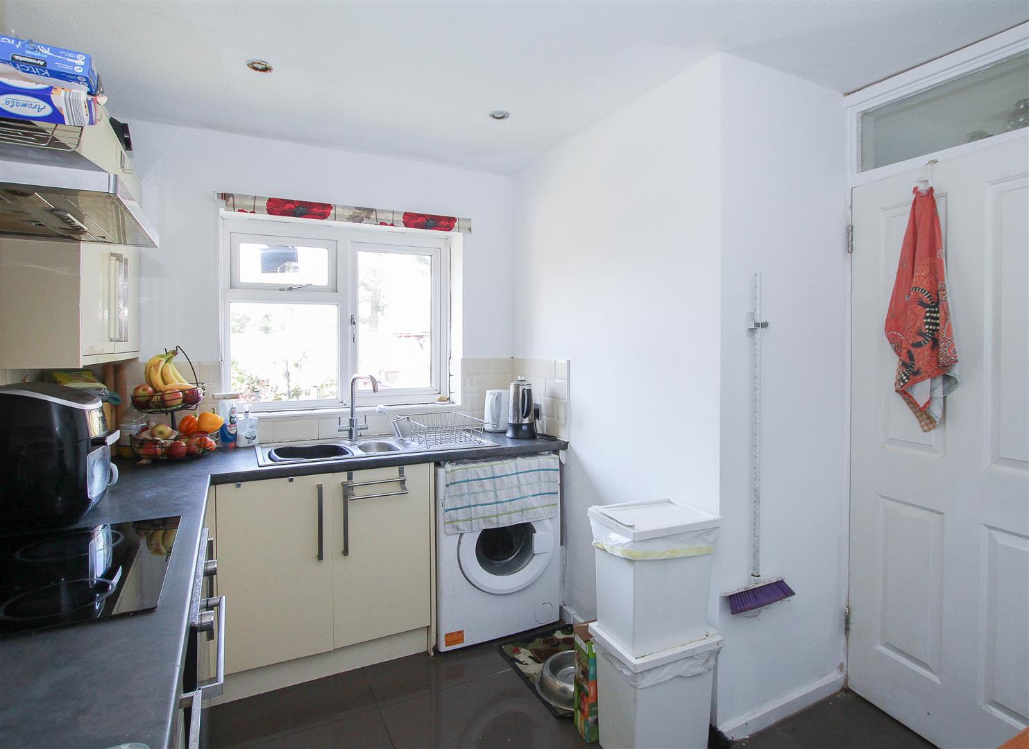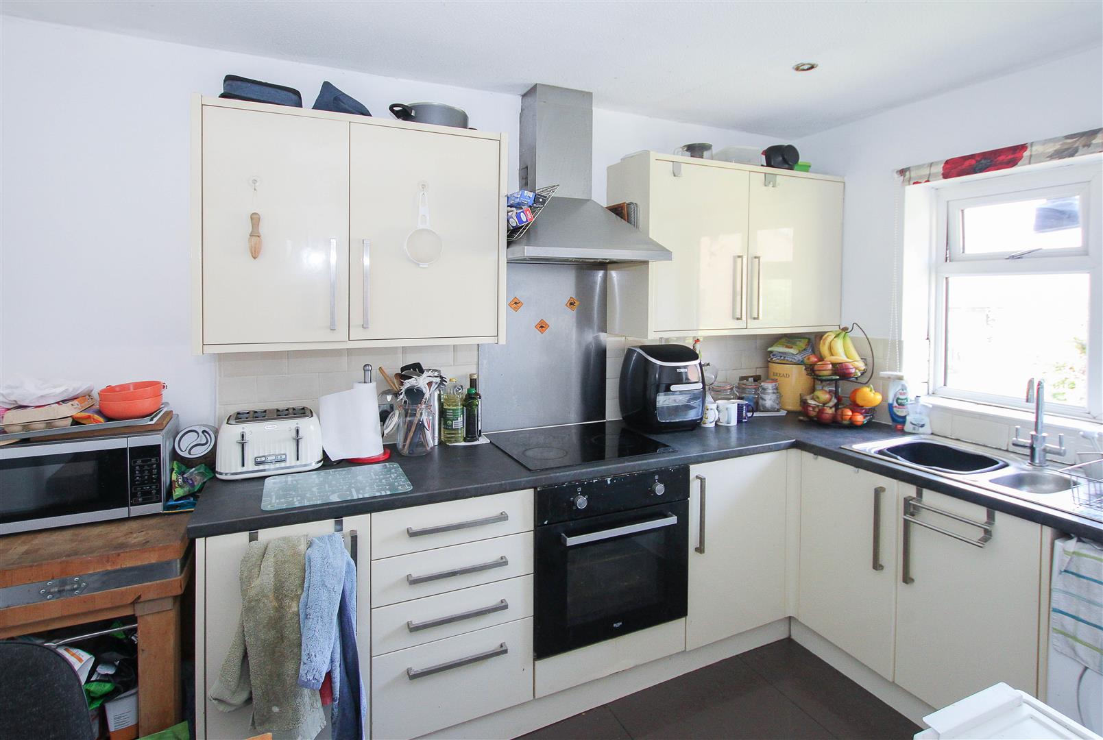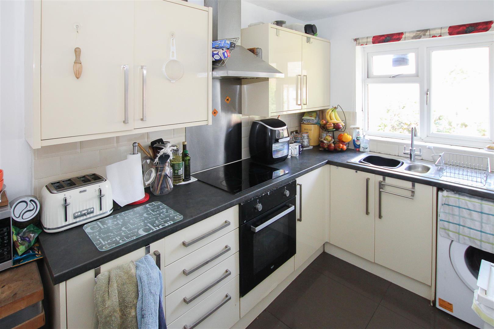 Kitchen - 3.43m x 2.90m narrowing to 2.24m (11'3" x 9'6" nar - Fitted with modern cream wall and base units with stainless steel handles, wrap around work surfaces. Integrated appliances to include four ring electric hob with electric oven under and extractor hood above. Stainless steel single drainer sink unit with mixer taps. Plumbing for washing machine. Part tiling above work surfaces. Window to front. Tiled floor. Low voltage chrome downlighters.