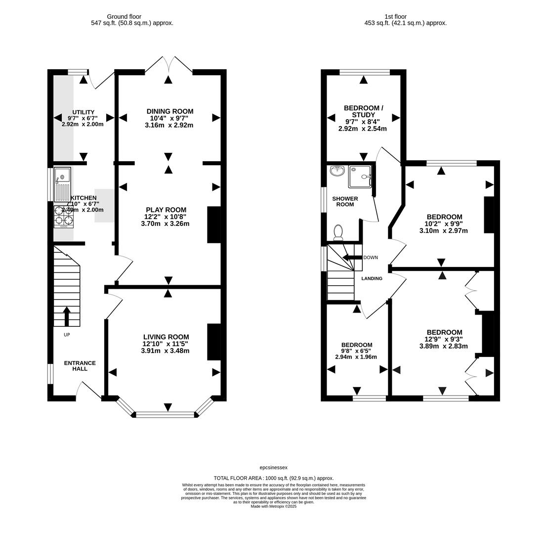 Upstairs, the landing provides access to all rooms. The principal bedroom sits at the front of the property and benefits from built-in wardrobes. A second double bedroom overlooks the rear garden, while two further well-proportioned single bedrooms offer flexible space for family, or a home office. A shower room completes the first floor.