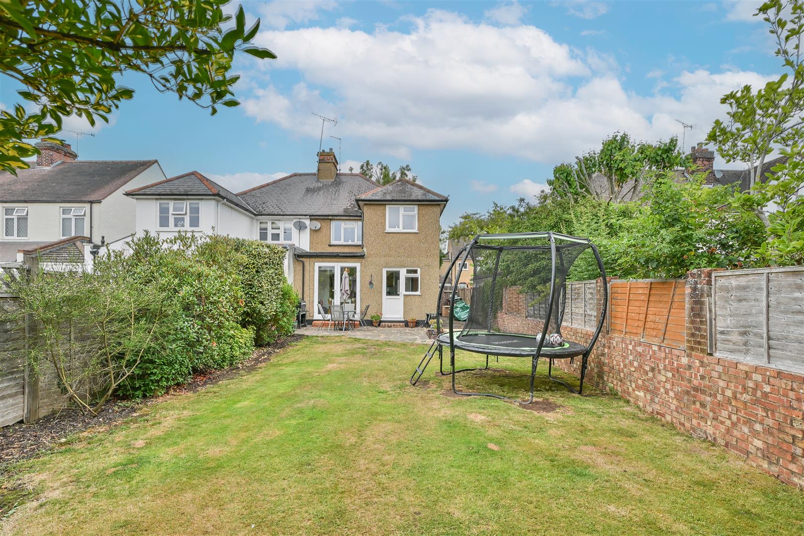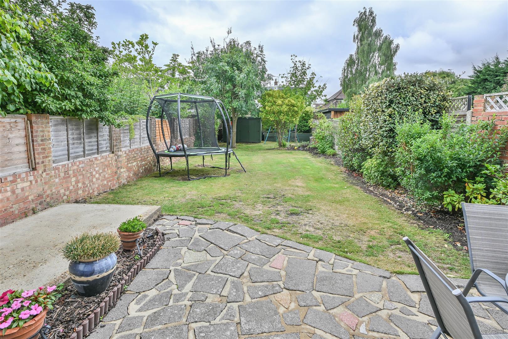 Outside, the rear garden begins with a paved patio area ideal for al fresco dining, leading to a spacious lawn bordered by mature shrubs. To the front, a private driveway provides convenient off-street parking.