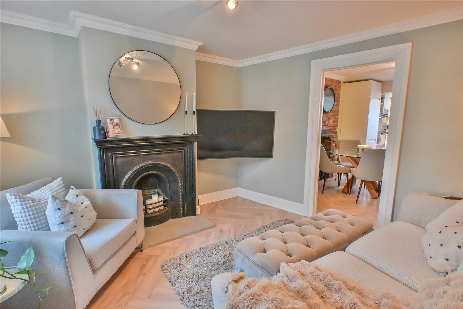 The internal accommodation opens with a welcoming porch leading into an elegant reception room, beautifully appointed with a feature fireplace that sets a refined and inviting atmosphere. To the rear, a truly impressive kitchen/diner forms the heart of the home, bathed in natural light and fitted with sleek, contemporary eye and base level units, complemented by a stylish breakfast bar - ideal for both entertaining and modern family living. A chic family bathroom completes the ground floor.