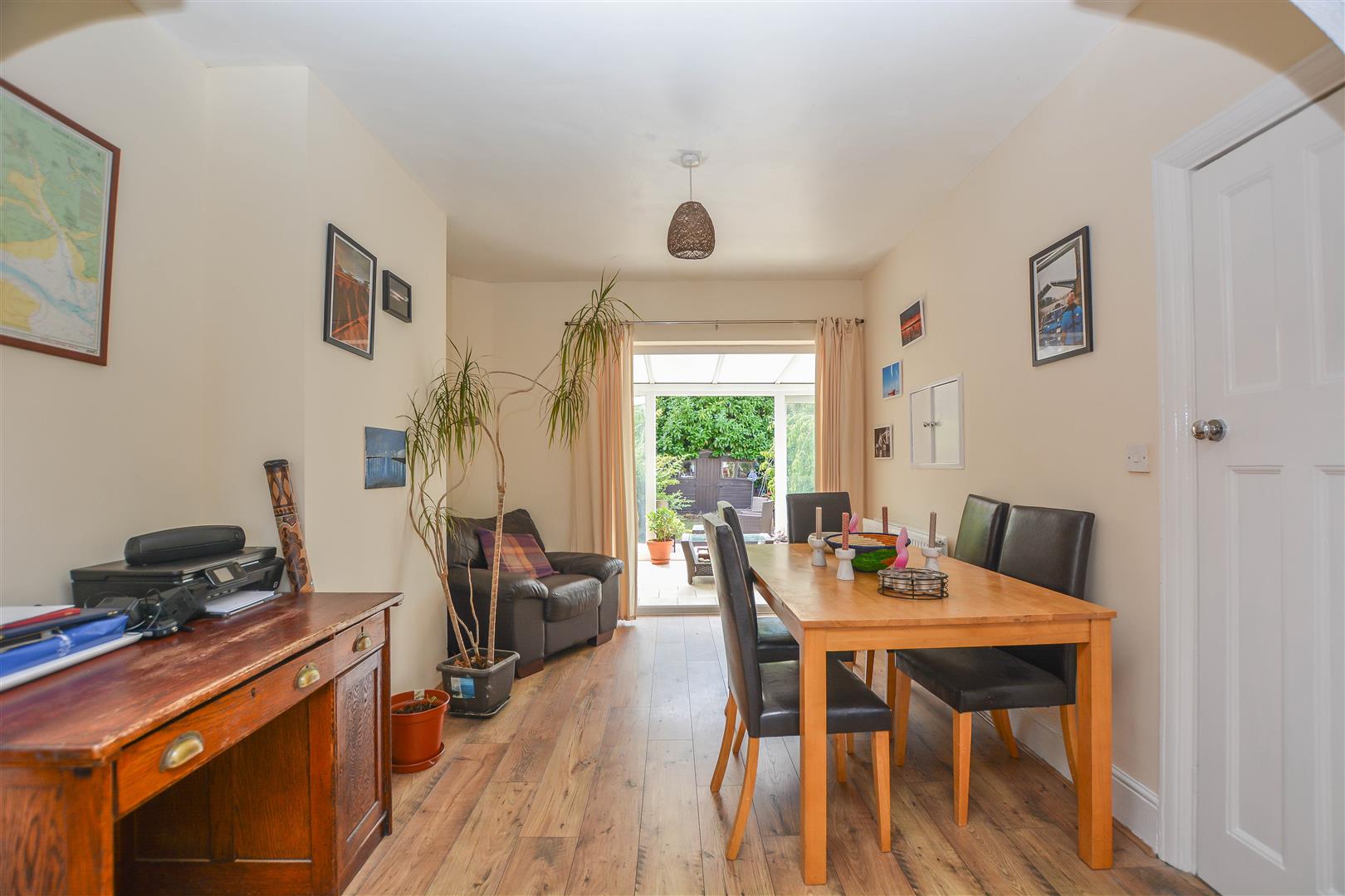 Adjoining the main reception room is a well-appointed kitchen, fitted with a range of eye and base level units, ample worktop space, and convenient access to the light-filled conservatory. The conservatory, featuring double doors to both the dining area and the rear garden, offers an ideal space for relaxed family living or entertaining.