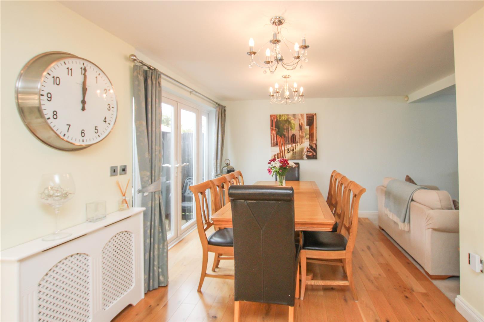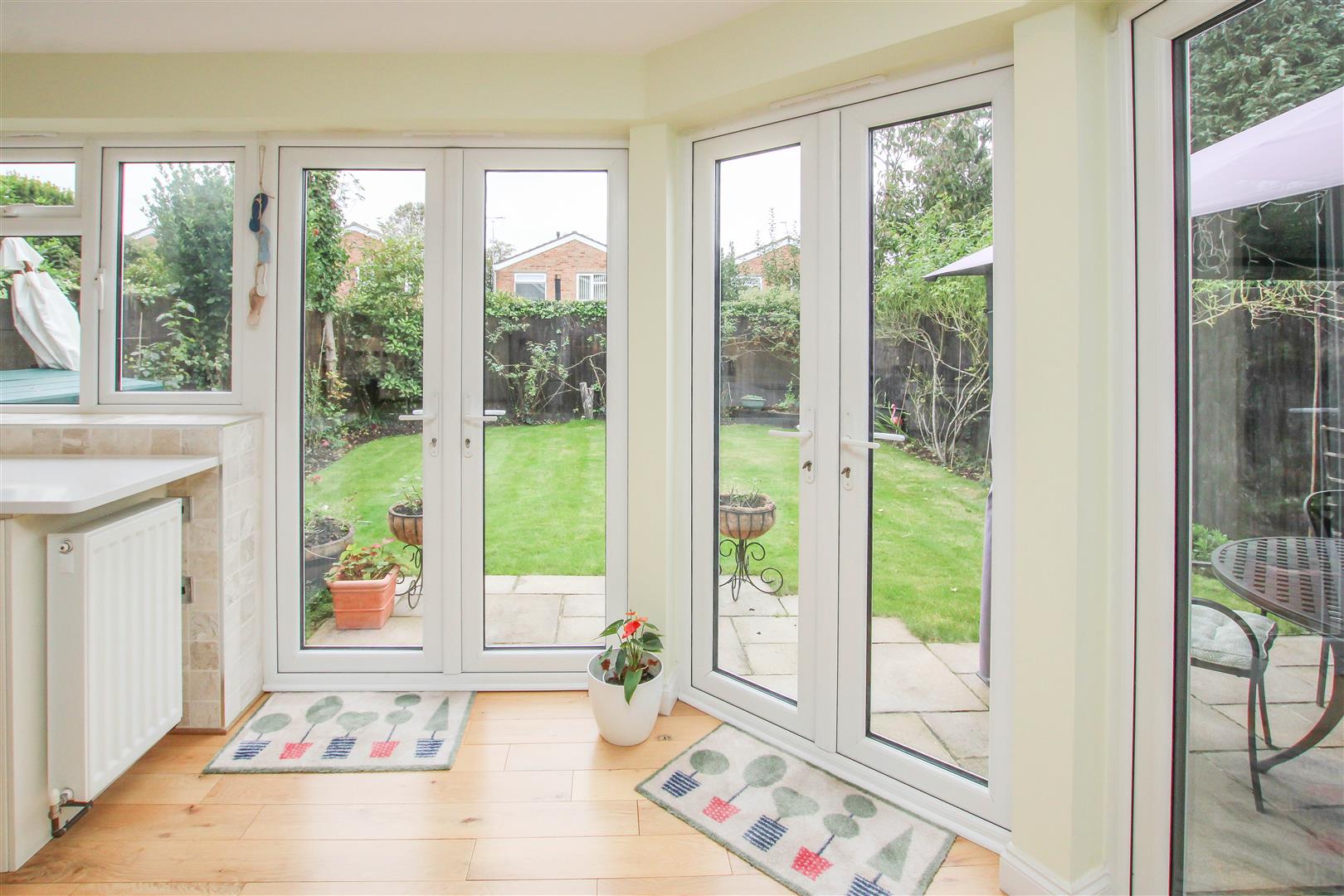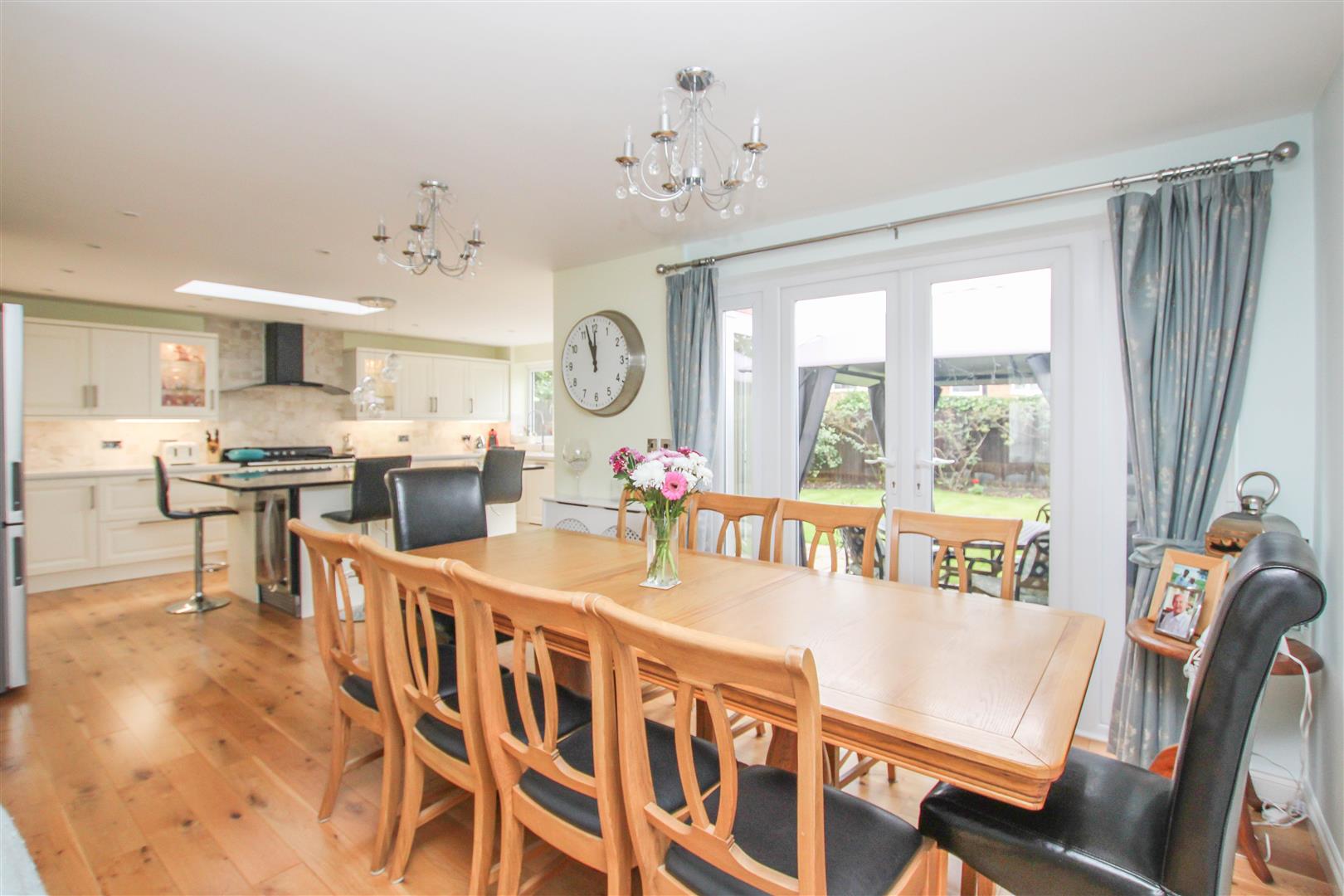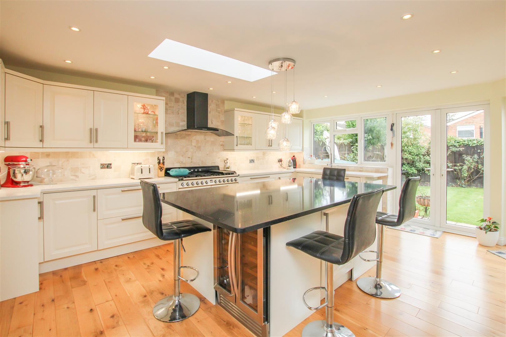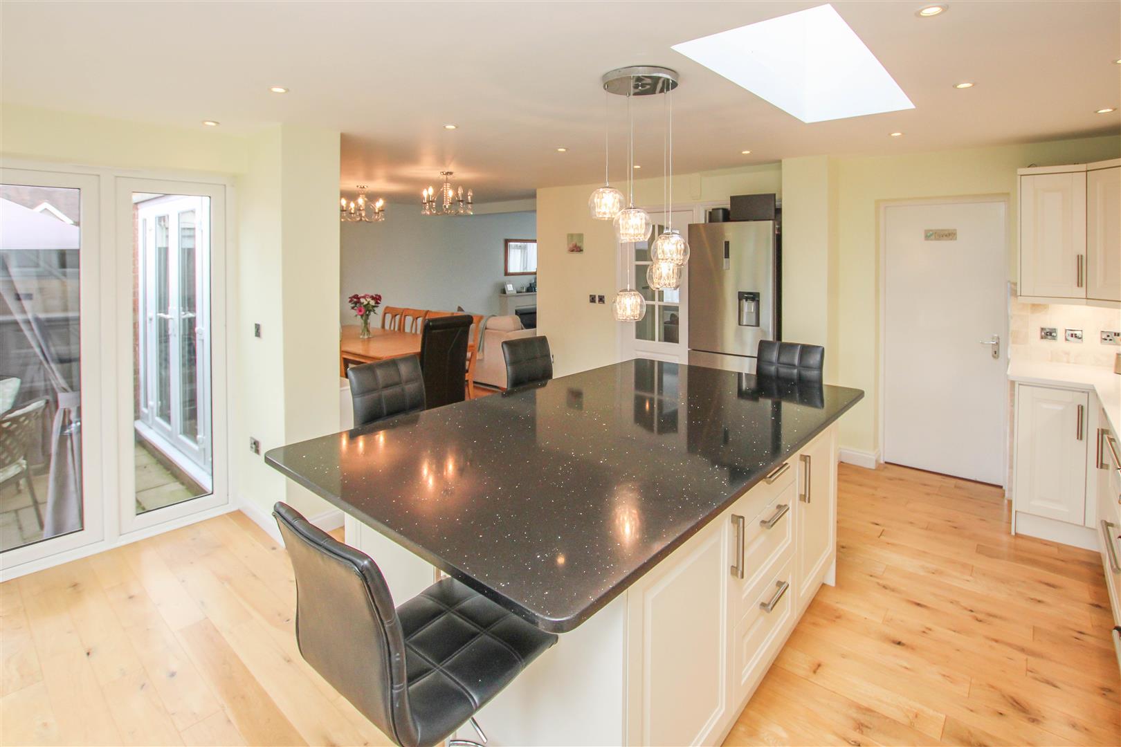 The internal layout commences with a welcoming entrance hall that leads to the impressive open-plan kitchen/diner, thoughtfully designed with sleek eye and base level units, granite worktops, and integrated appliances. Three sets of double doors overlook and open onto the rear garden, flooding the space with natural light and creating a seamless indoor-outdoor connection-ideal for entertaining or relaxed family living.