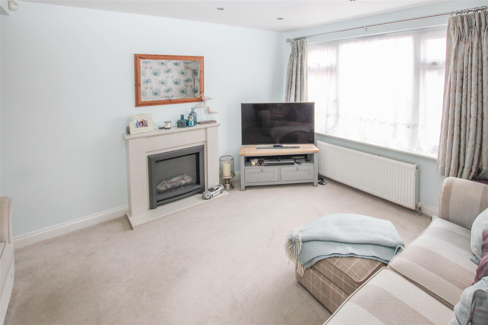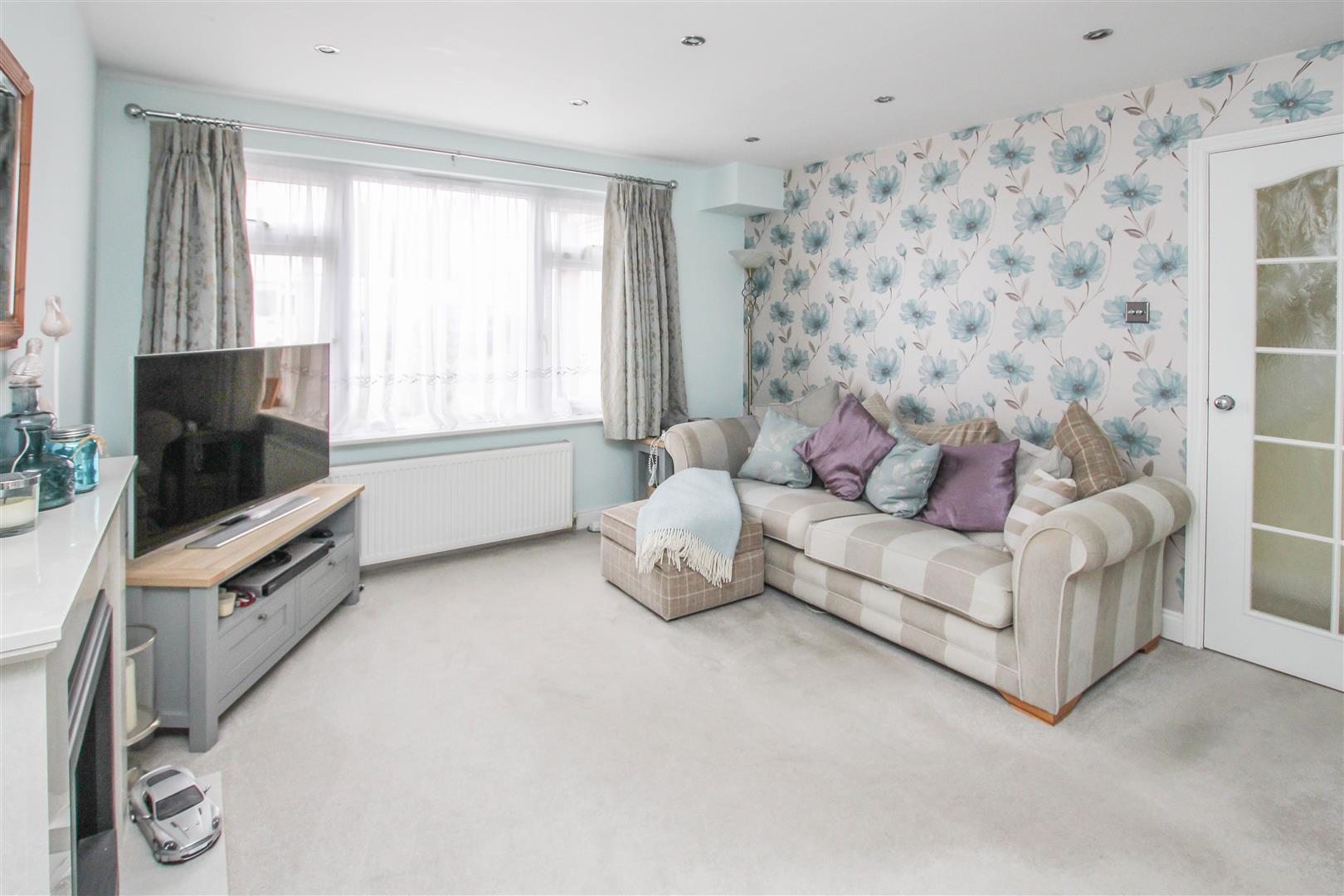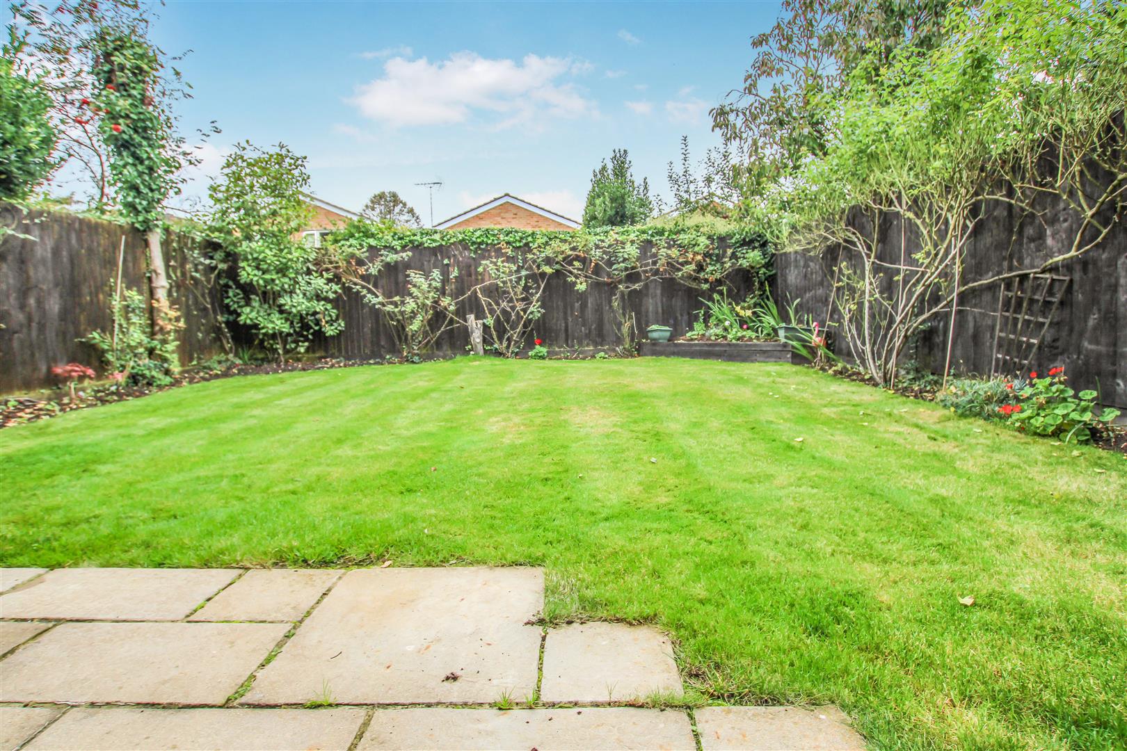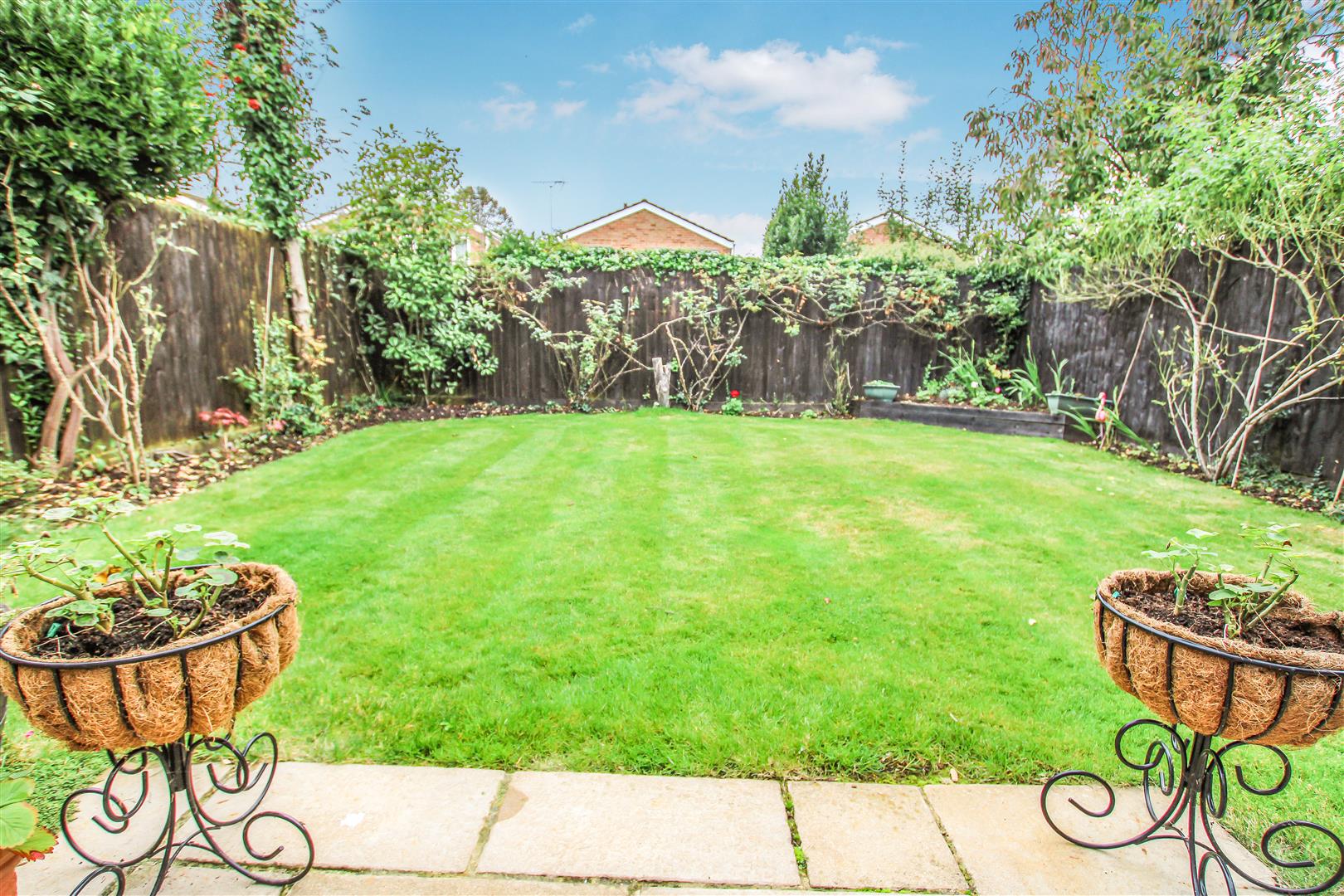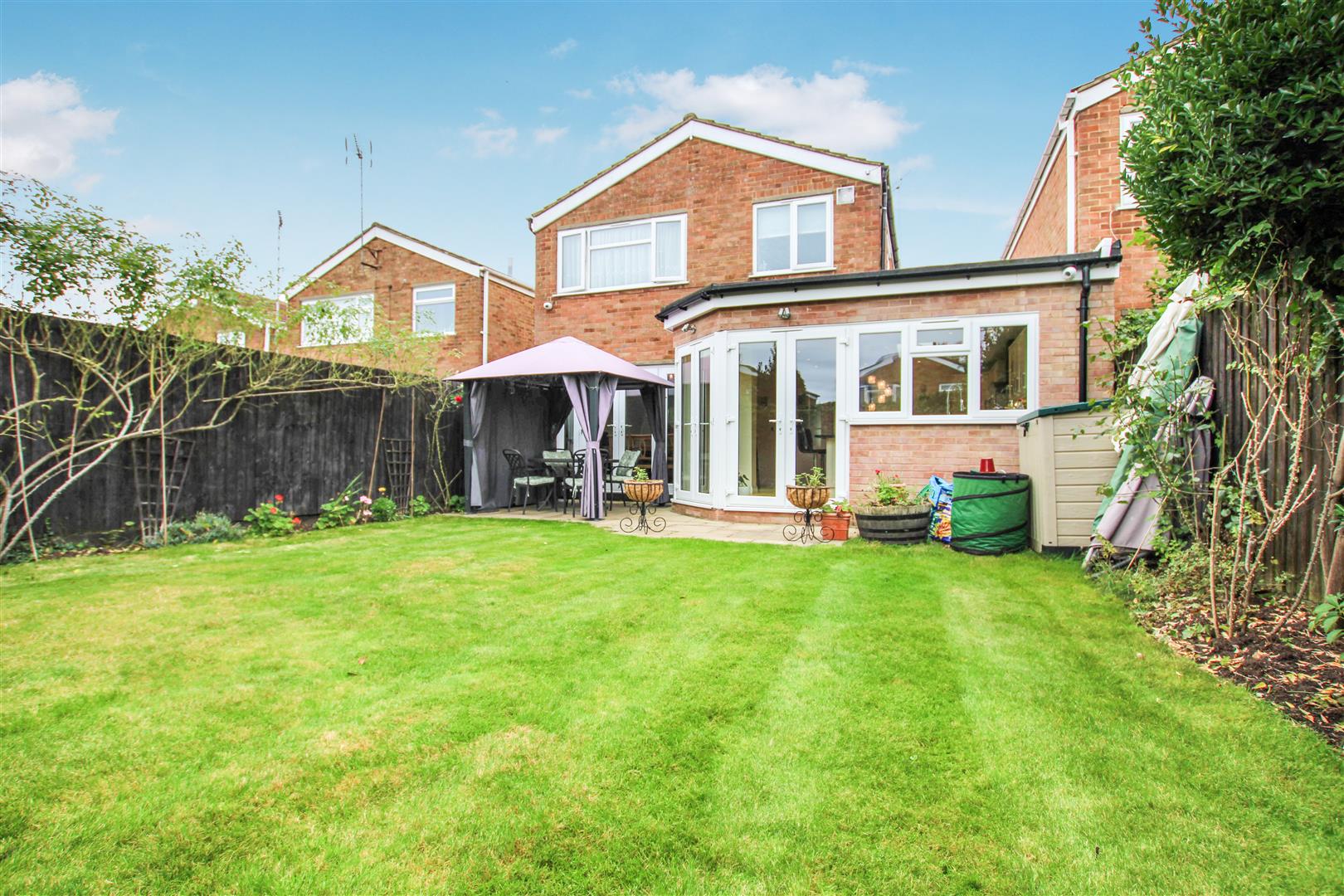 Outside, the rear garden begins with a paved seating area, which extends to a well-maintained lawn bordered by mature shrubs. To the front, a small lawn enhances the property's kerb appeal, while a block-paved driveway provides off-street parking and leads to an integral garage with an up-and-over door.