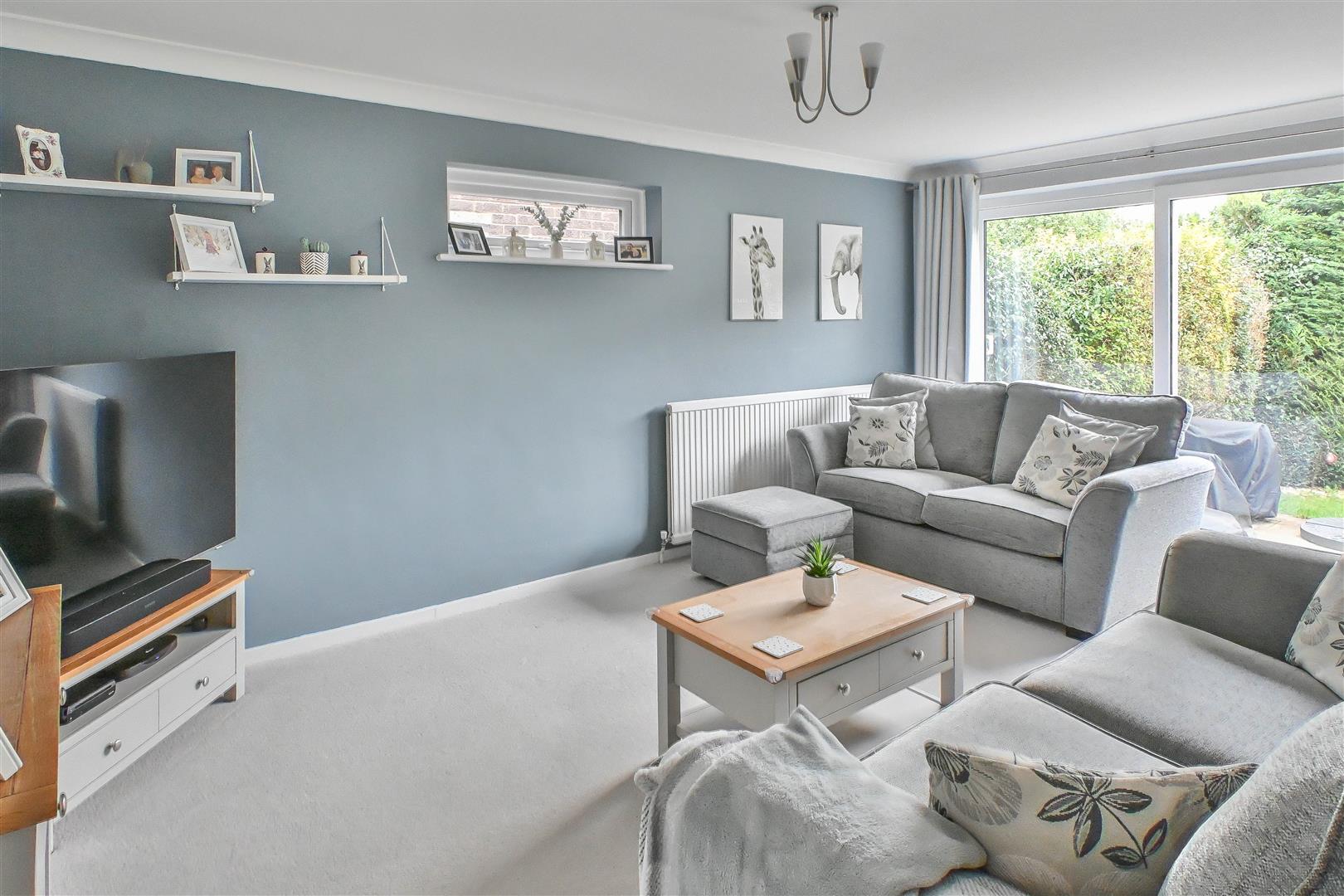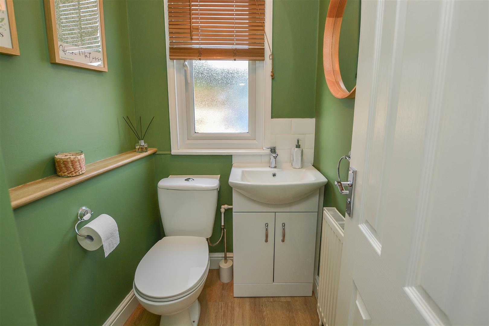 The internal layout begins with an enclosed porch leading into a welcoming entrance hall, which provides access to the garage, a ground floor cloakroom, and the impressive kitchen/diner. The well-appointed kitchen is fitted with a range of stylish eye and base level units complemented by contrasting worktops and integrated appliances, with a window overlooking the rear garden. The adjoining dining area is filled with natural light from a side window and features a door opening to the exterior - creating an ideal setting for everyday family living and entertaining. The living room is a generously proportioned and elegantly decorated space, enhanced by sliding doors that overlook and open directly onto the rear garden, seamlessly blending indoor and outdoor living.
