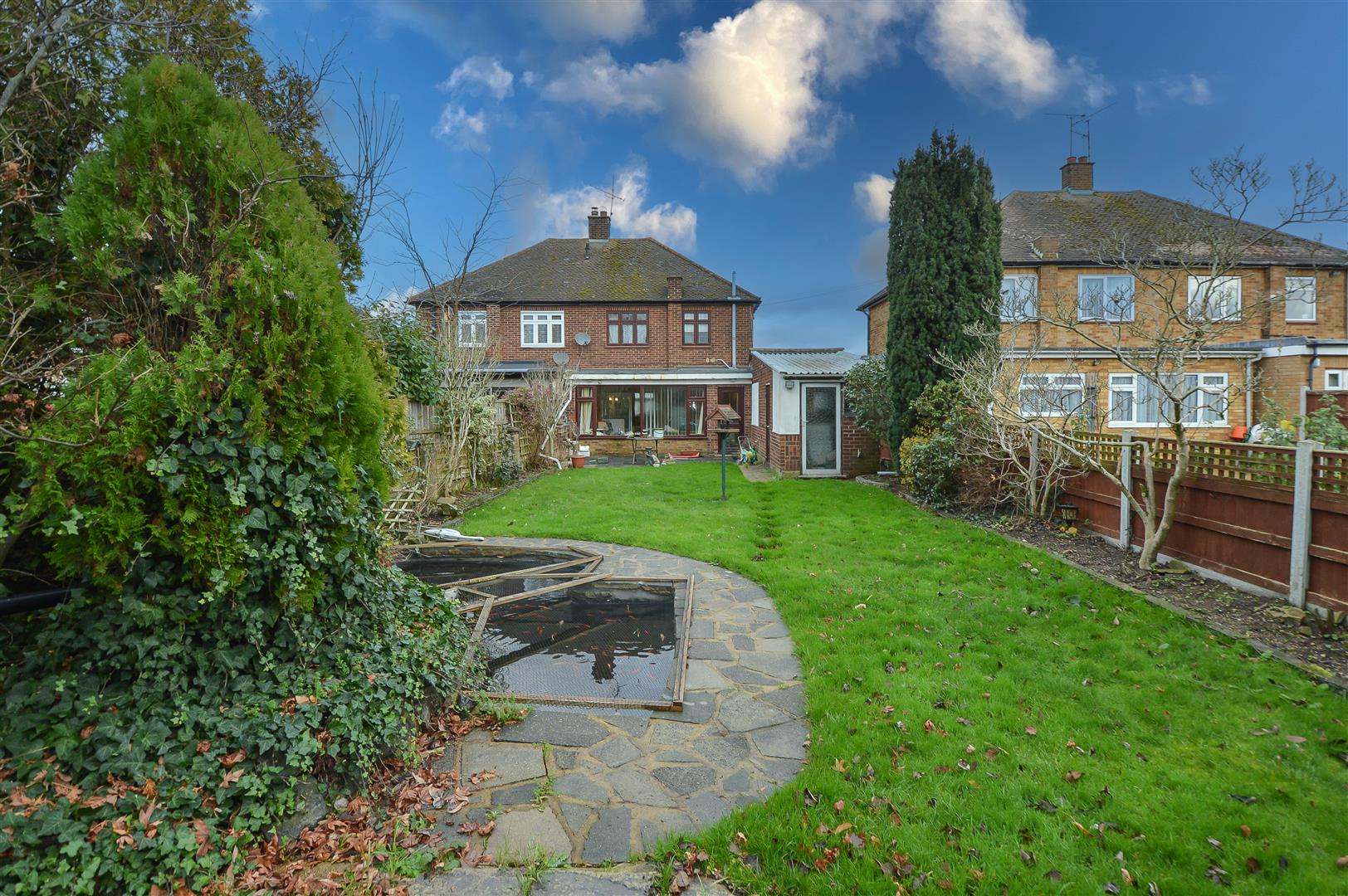 Externally, the property has a paved driveway at the front, leading to a garage with convenient access via double doors. The rear garden is mainly laid to lawn, enhanced by mature shrub borders, a tranquil fishpond, and side access to the garage and garden store.