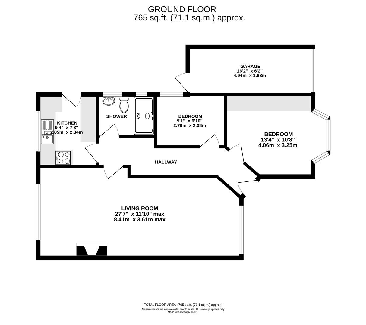 The internal layout begins with a welcoming entrance hallway providing access to all rooms. The spacious living room is an impressive 27'7 x 11'10 and features dual aspect windows. The well-appointed kitchen is fitted with a range of eye and base level units, ample countertop space, and doorway leading out to the rear garden. The principal bedroom, located at the front of the property, is a generously sized double room featuring a charming bay window and built-in wardrobes. The second bedroom is a comfortable single room with side window and a newly installed, fully tiled shower room completes the interior layout.