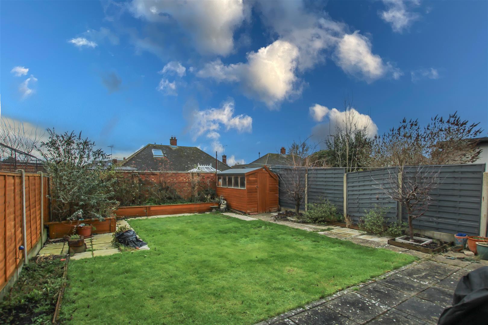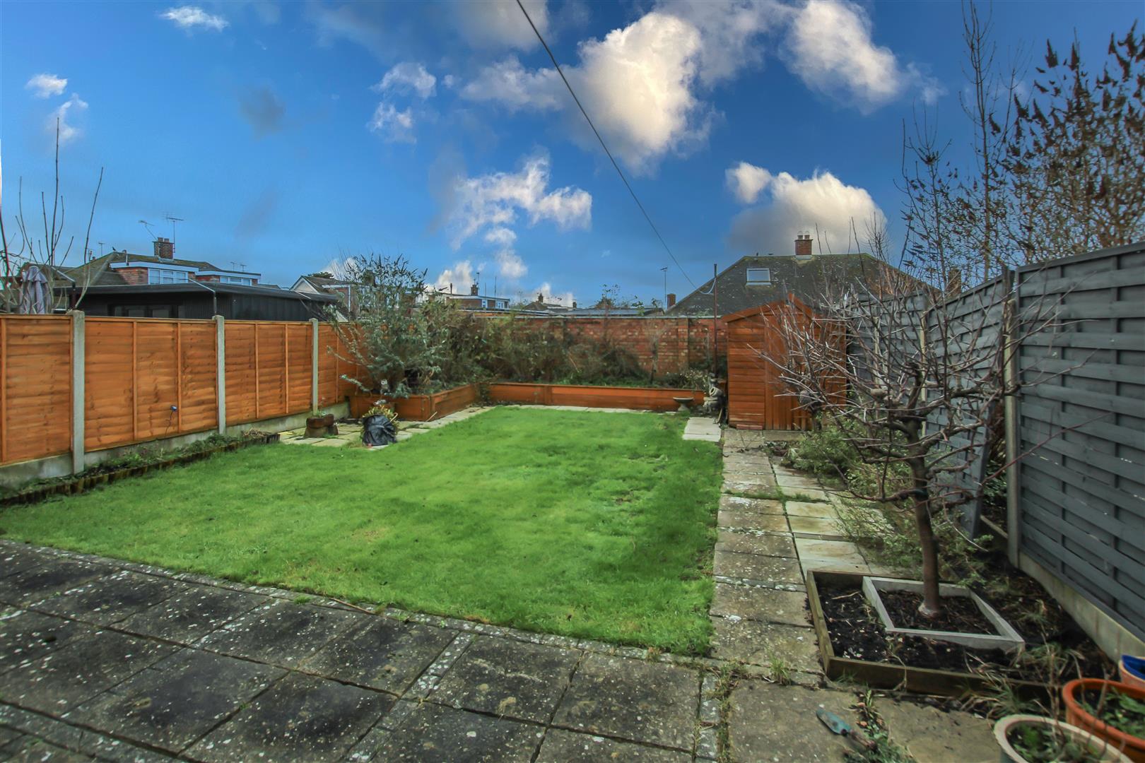 Externally, the rear garden opens with a paved patio area, leading to a well-maintained lawn with mature shrubs at the far end. The front of the property features a spacious driveway offering ample off-street parking and access to the attached garage via an up-and-over door.