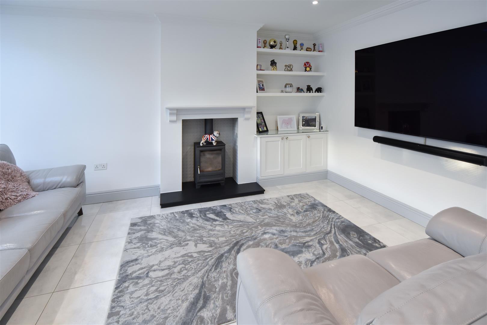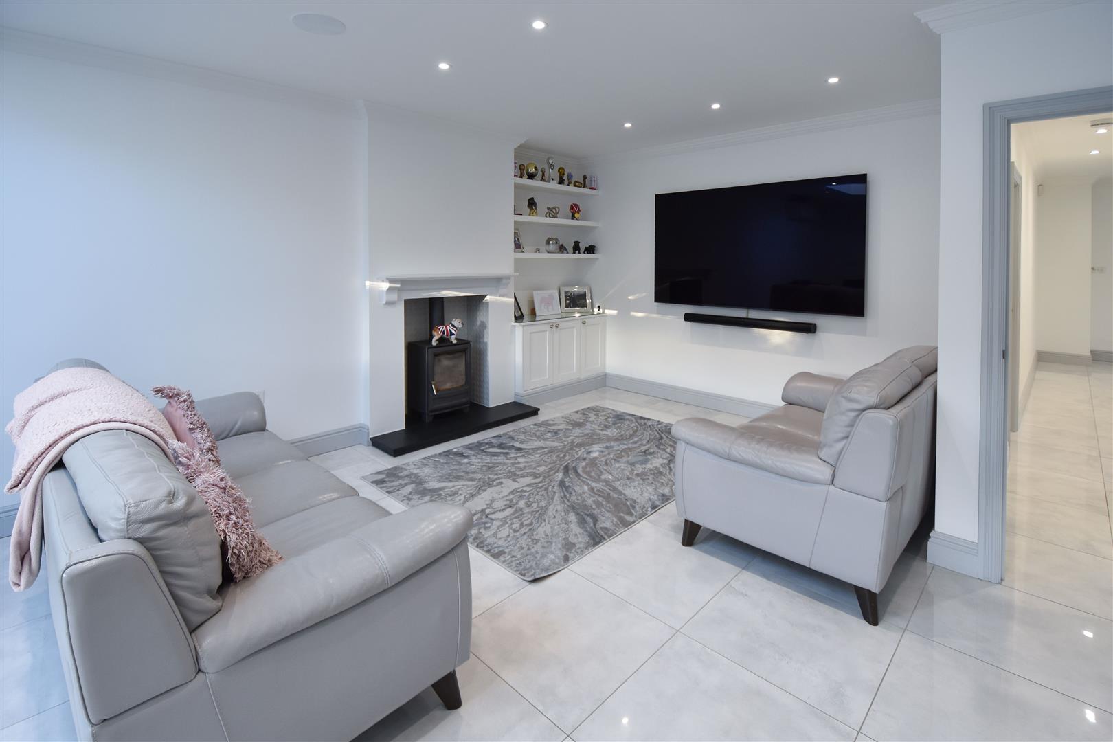 Entering the property a bright and spacious reception hallway has stairs rising to the first floor and doors to all rooms. The hallway has a polished tiled flooring which extends through the whole of the ground floor, with underfloor heating being laid in the kitchen/family room, where there is also an air conditioning unit installed. There is a good amount of storage available in the hallway, with two single built-in storage cupboards and a further double built-in storage cupboard. A cosy living room sits at the front of the property, providing a comfortable space away from the main hub of the home, which is almost certainly the fabulous, kitchen/family room. The kitchen/family room which forms the extension to the rear is a lovely space for family & friends to gather, with bi-folding doors spanning the width of the room opening into garden. To one corner there is lounge area with ample space for furniture and with a feature log burning stove. There is ample space for a large, family dining table and chairs with the remainder of the room being fitted with stylish, dark grey wall and base units with contrasting work surface over, and a central island unit with seating. Integrated appliances include two double ovens, double fronted fridge freezer, dishwasher and a halogen hob inset into the central island with a ceiling extractor above. There is further space for appliances and storage in a separate utility room off the kitchen, which also offers further access into the garden. Finishing the accommodation on the ground floor is a fully tiled shower room with a double walk-in shower, wash hand basin and w.c., and a good-sized reception/playroom which could be utilised as a ground floor fourth bedroom if desired.