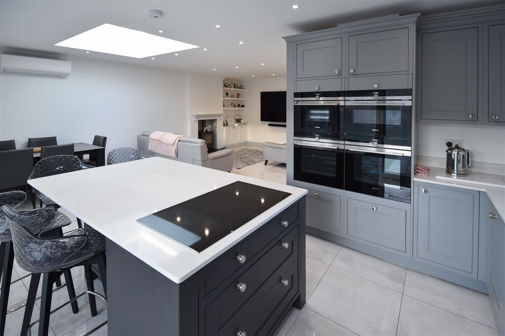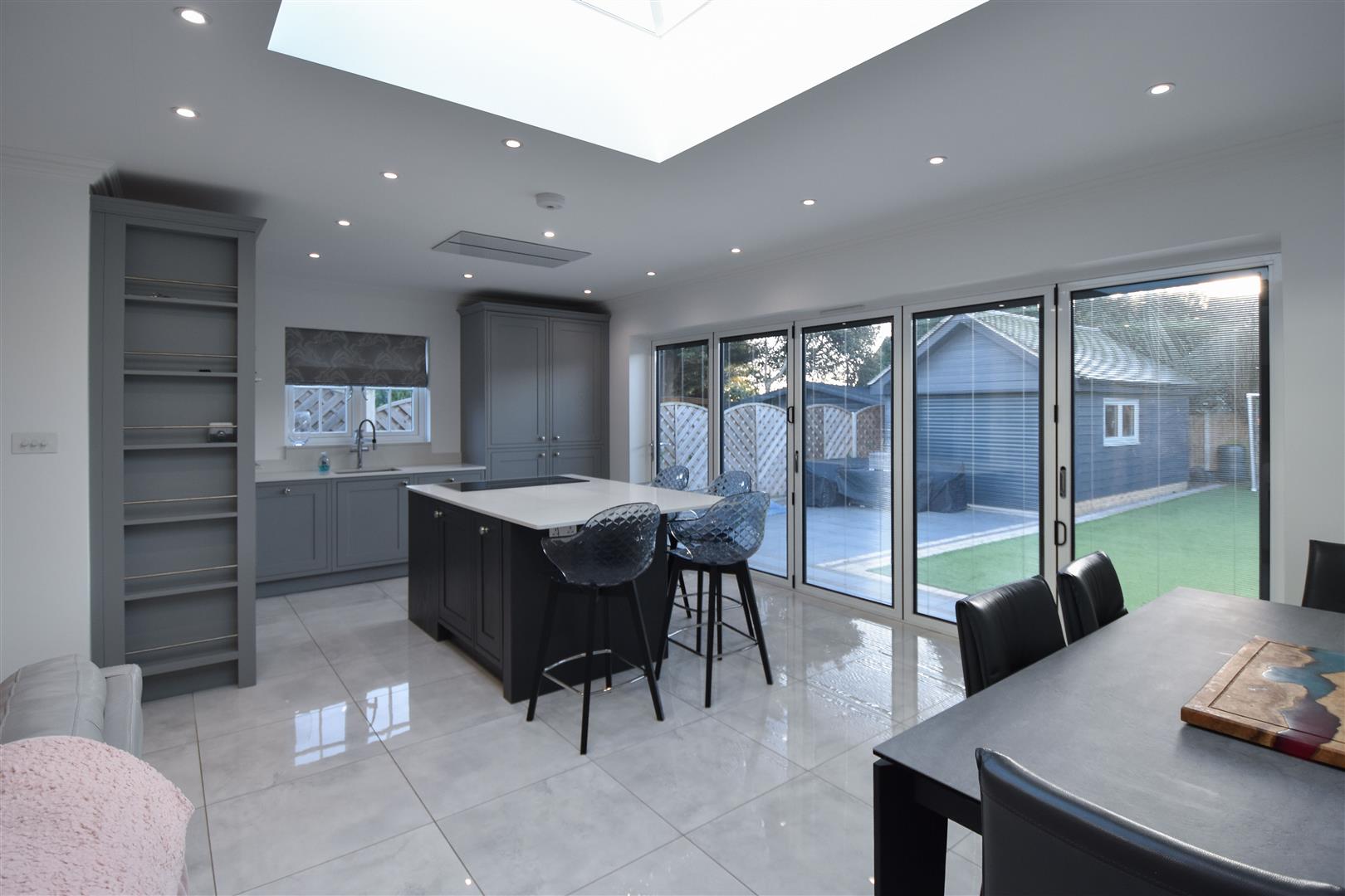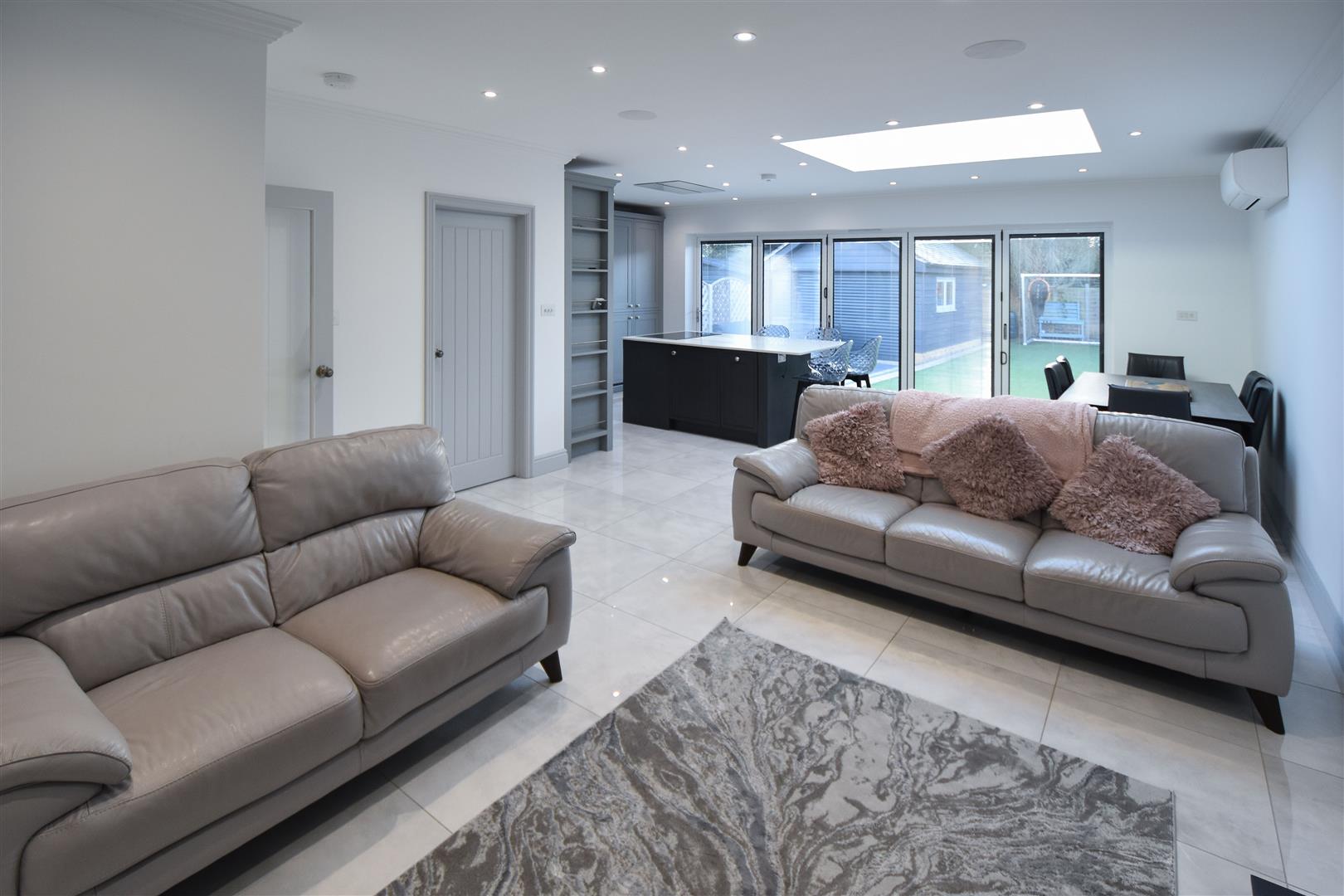Kitchen / Family Room - 8.00m x 7.11m (max measurements) (26'3 x 23'4 (max - Stylish, dark grey wall and base units with contrasting work surface over provide ample storage options. Integrated appliances, including two double ovens, double fronted fridge/freezer and dishwasher. There is a central island with seating, which includes further storage and a halogen hob with extractor above (set flush into the ceiling). The family room space features a log burning stove and fitted shelving/storage to the side. Bi-folding doors give access into the garden. Underfloor heating. and air con unit. Door to :