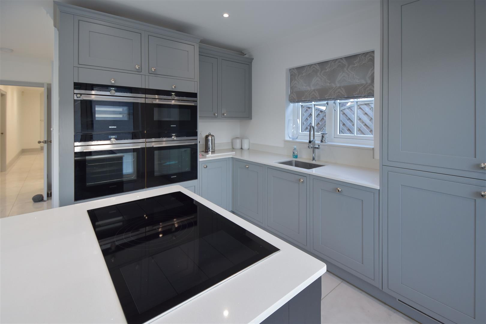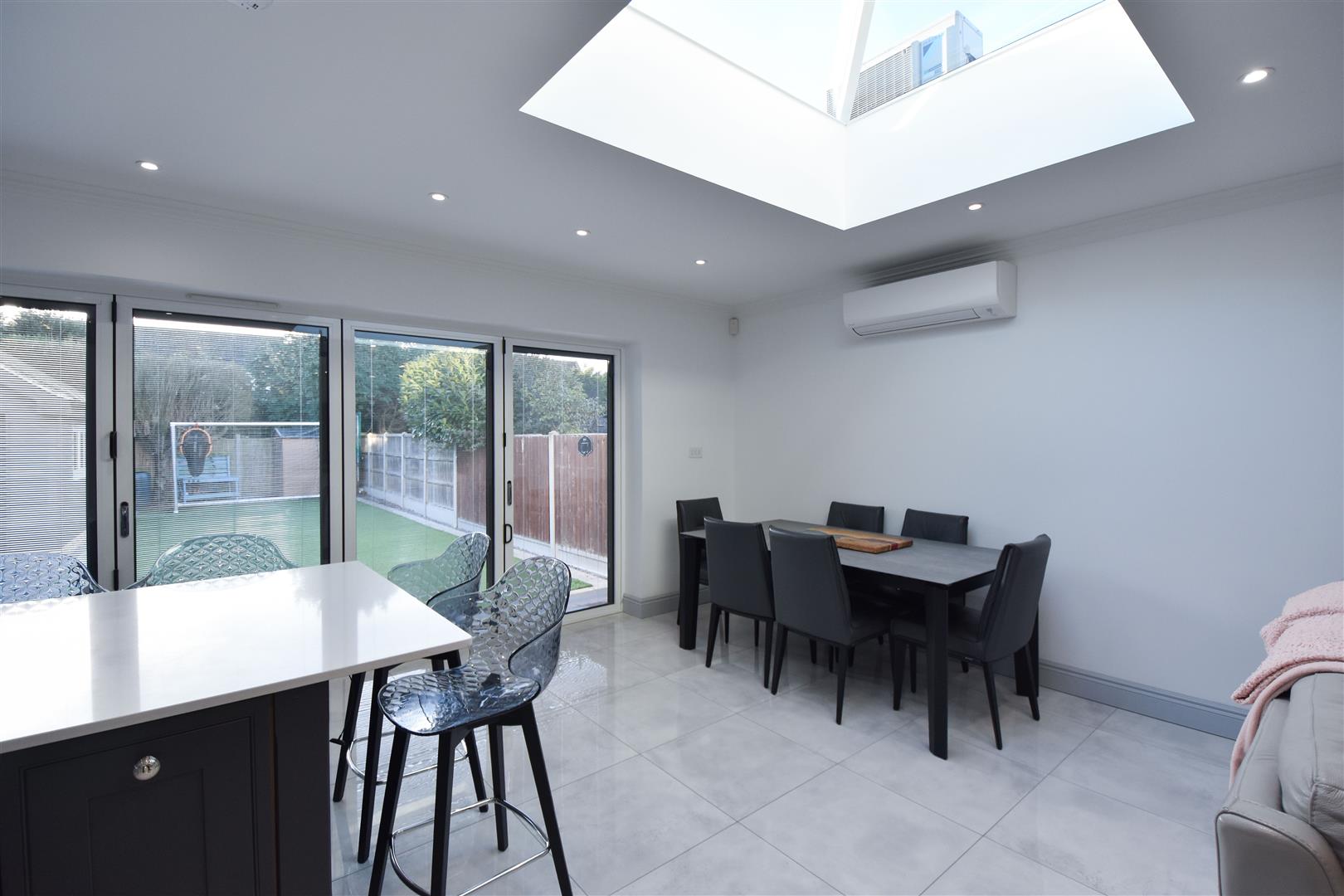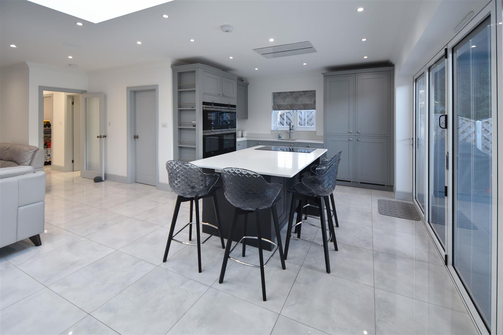 Kitchen / Family Room - 8.00m x 7.11m (max measurements) (26'3 x 23'4 (max - Stylish, dark grey wall and base units with contrasting work surface over provide ample storage options. Integrated appliances, including two double ovens, double fronted fridge/freezer and dishwasher. There is a central island with seating, which includes further storage and a halogen hob with extractor above (set flush into the ceiling). The family room space features a log burning stove and fitted shelving/storage to the side. Bi-folding doors give access into the garden. Underfloor heating. and air con unit. Door to :