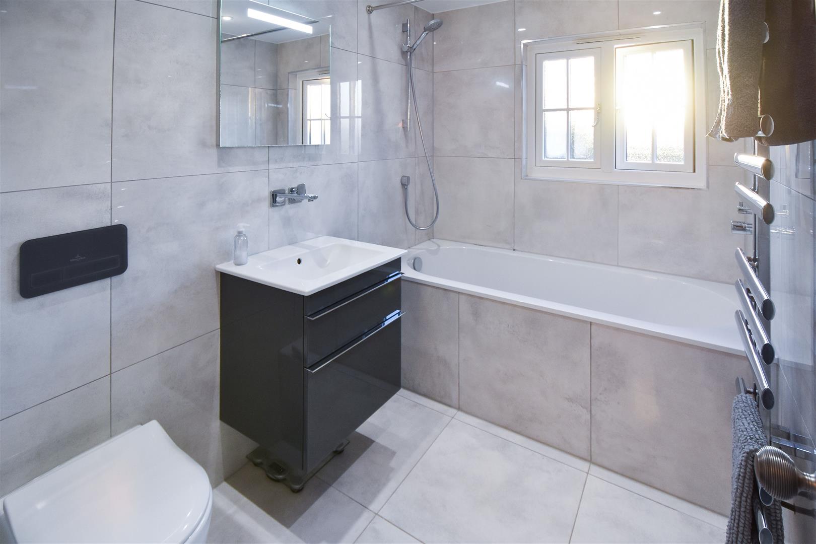 Main Family Bathroom - Fully tiled. Panelled bath with shower over, wash hand basin set into a floating vanity unit and w.c..