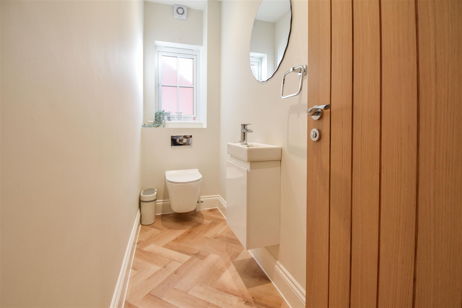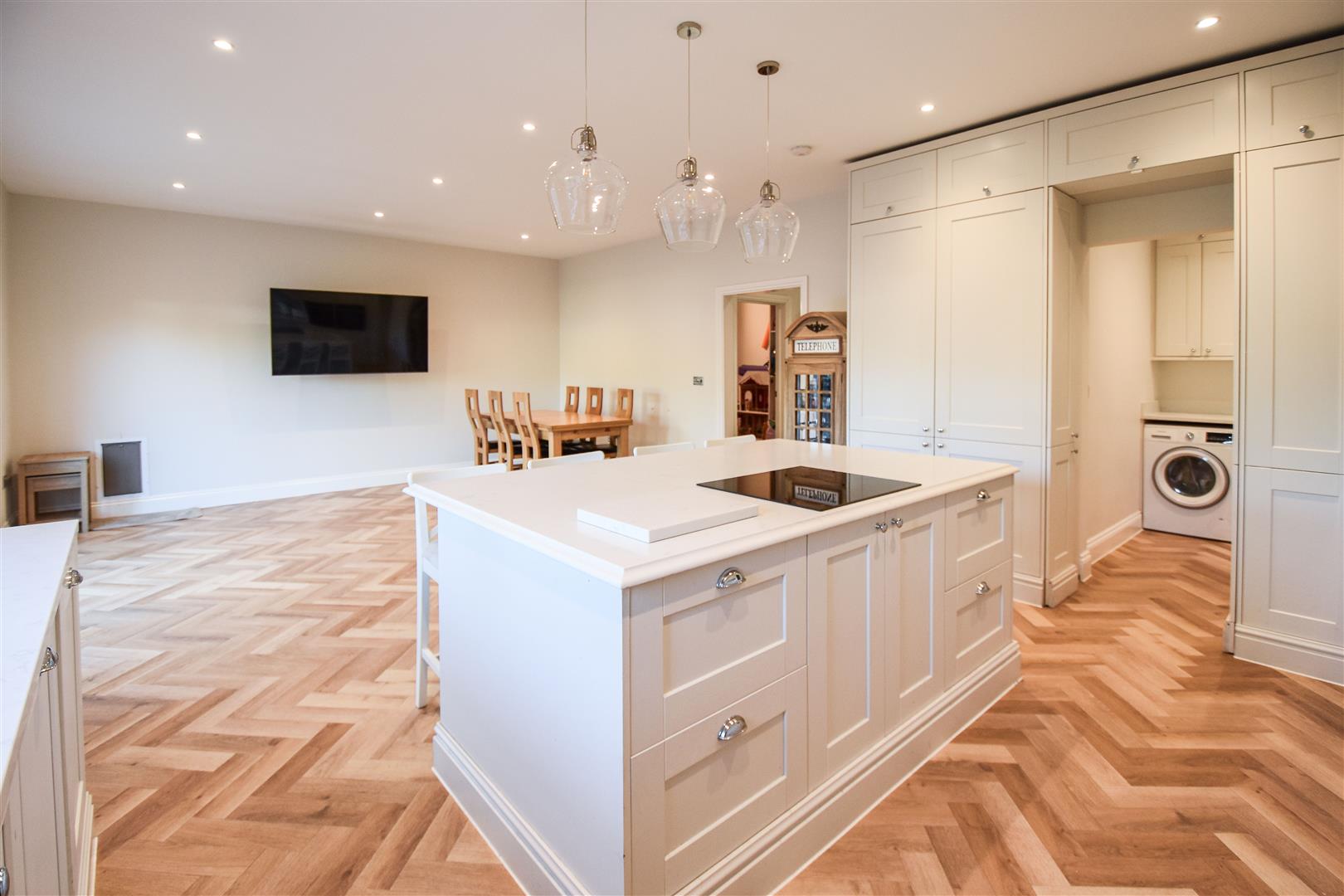 Entering the property via a covered porch you find yourself in a bright and spacious hallway with stylish 'Herringbone' LVT (luxury vinyl tile) flooring which extends through the whole of the ground floor. There are doors to all main rooms and a staircase which rises to the first-floor level. Sitting to the front of the property there is a comfortable lounge with built-in media wall with contemporary inset fireplace below. To the rear of the property and spanning the width of the house is an impressive kitchen / diner / family room with bespoke fitted wall and base units with quartz work surface over, providing ample storage. There is an island unit with inset hob and further storage with integrated appliances to include double ovens, fridge/freezer and dishwasher. Off the kitchen, hidden behind 'secret double doors' is a separate utility room, where you have space and plumbing for additional appliances and wall and base units matching those of the kitchen, including a sink unit. Families with children will note that there is a separate playroom; this room could also be utilized as a quiet study for those looking for a space to work from home. Finally, a ground floor cloakroom is located off the hallway, with white space saver wash hand basin and close coupled w.c.