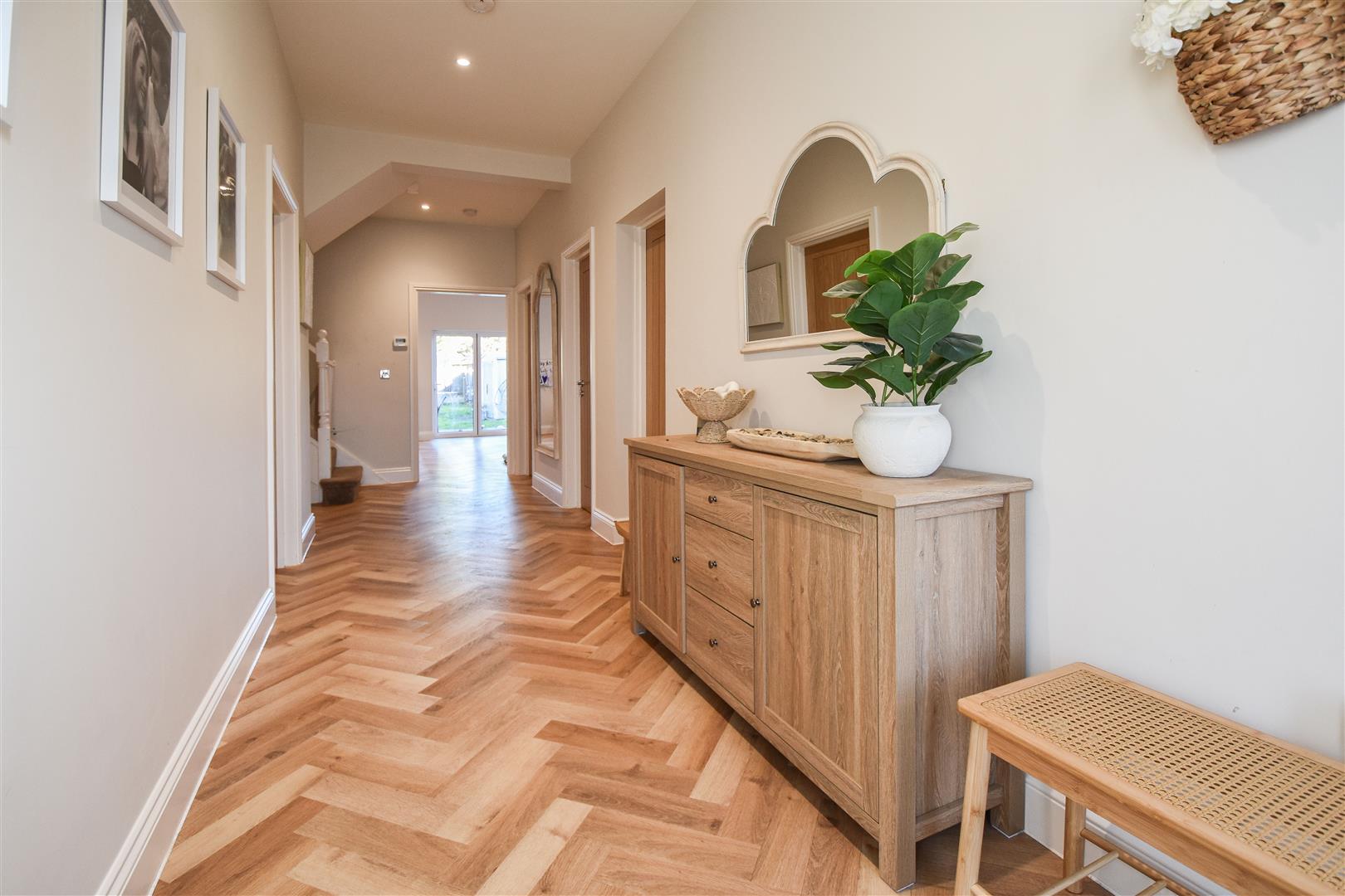 Entrance Hall - Spacious & bright with doors to all main ground floor rooms. Stairs to first floor. Herringbone LVT (Luxury vinyl tile) flooring which extends throughout the whole of the ground floor.