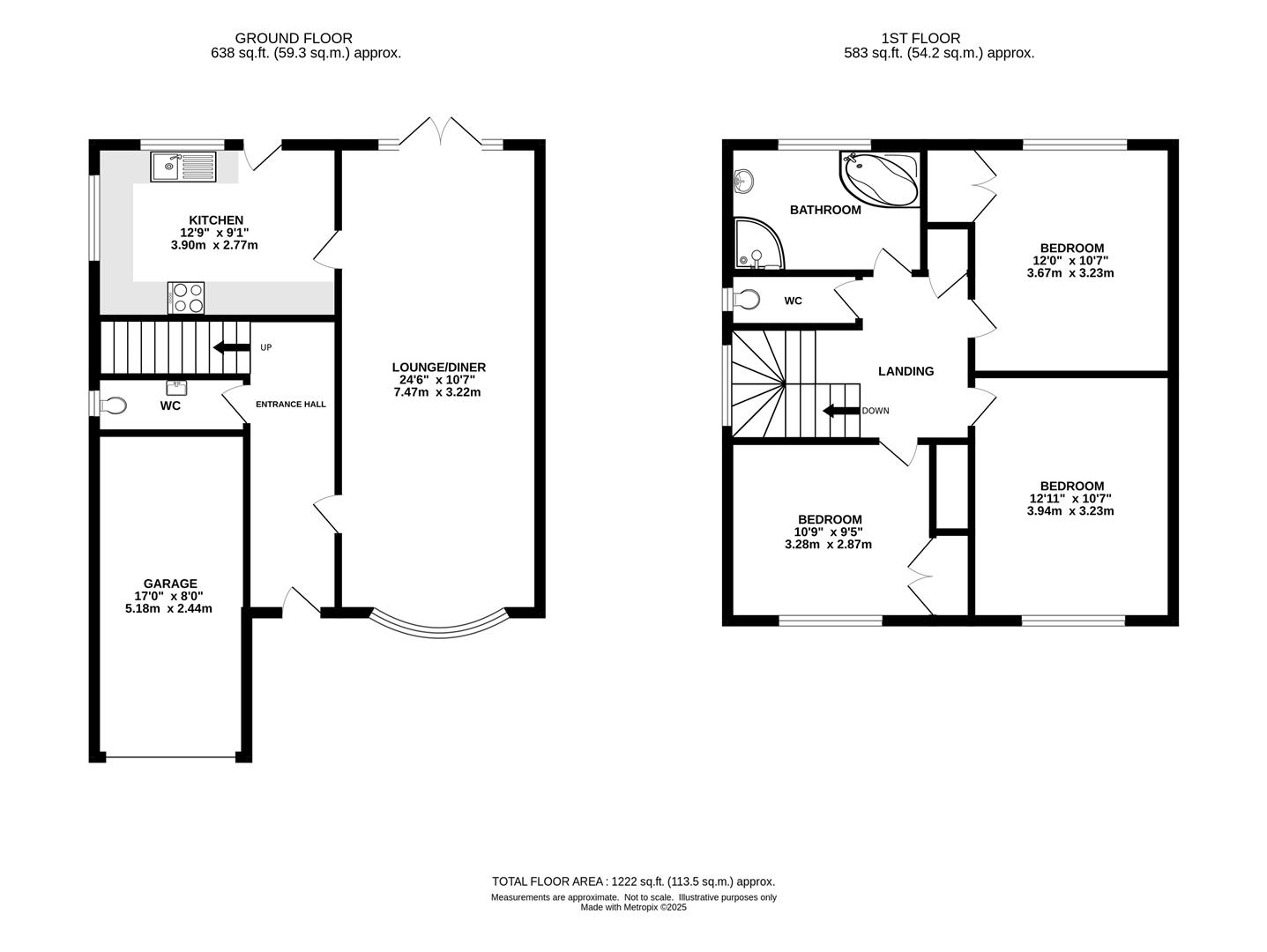 Upstairs, the landing provides access to all rooms. All three bedrooms are generously proportioned and benefit from built-in storage. Completing the first floor is the family bathroom, comprising a corner bath, fitted shower, and a separate WC with wash hand basin.