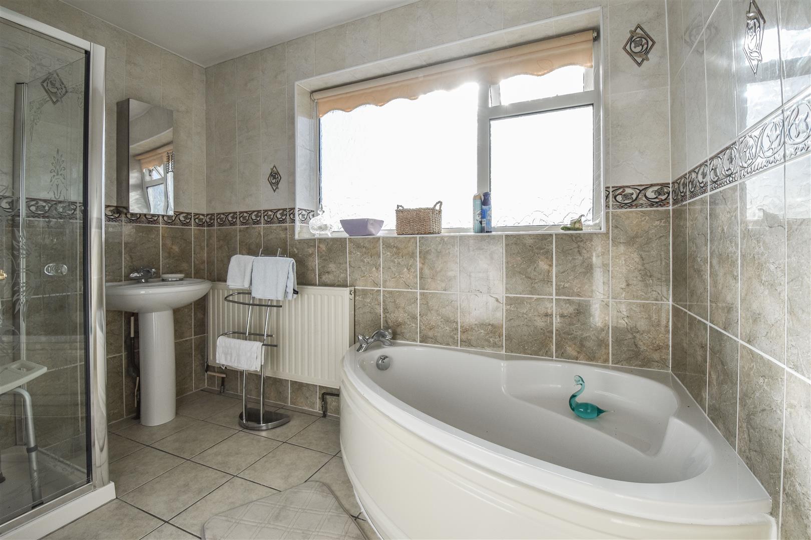 Family Bathroom - Fitted with a corner bath, separate shower and sink.