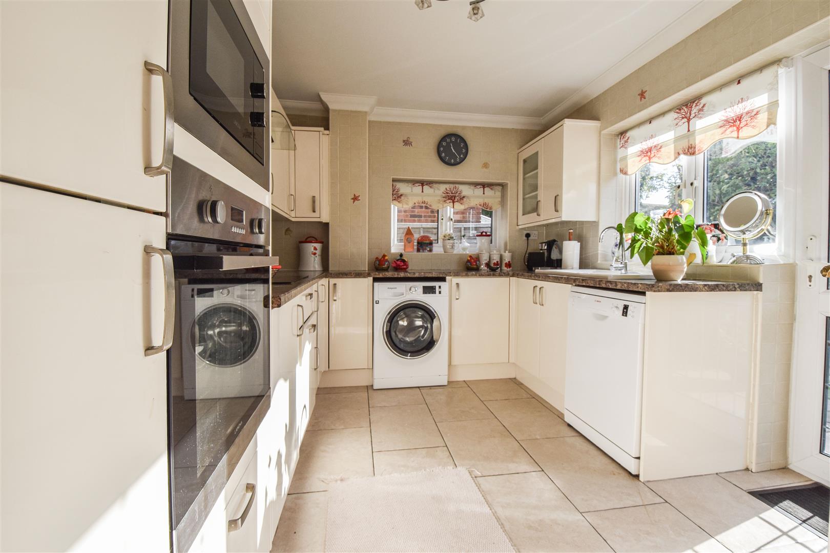 The ground floor offers a light and spacious lounge/diner, with a bay window to the front and French doors opening onto the rear garden. The lounge features an attractive marble-effect fireplace with fire insert, creating a cosy focal point. A door leads through to the well-fitted kitchen, which is equipped with a range of cream wall and base units complemented by contrasting work surfaces. Integrated appliances include an oven, hob with extractor above, and fridge/freezer. A rear door from the kitchen provides direct access to the garden - ideal for outdoor entertaining or family dining.