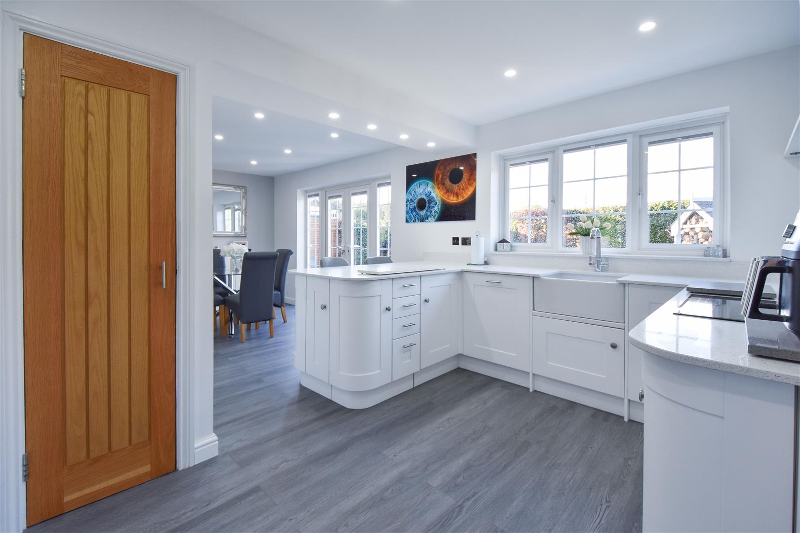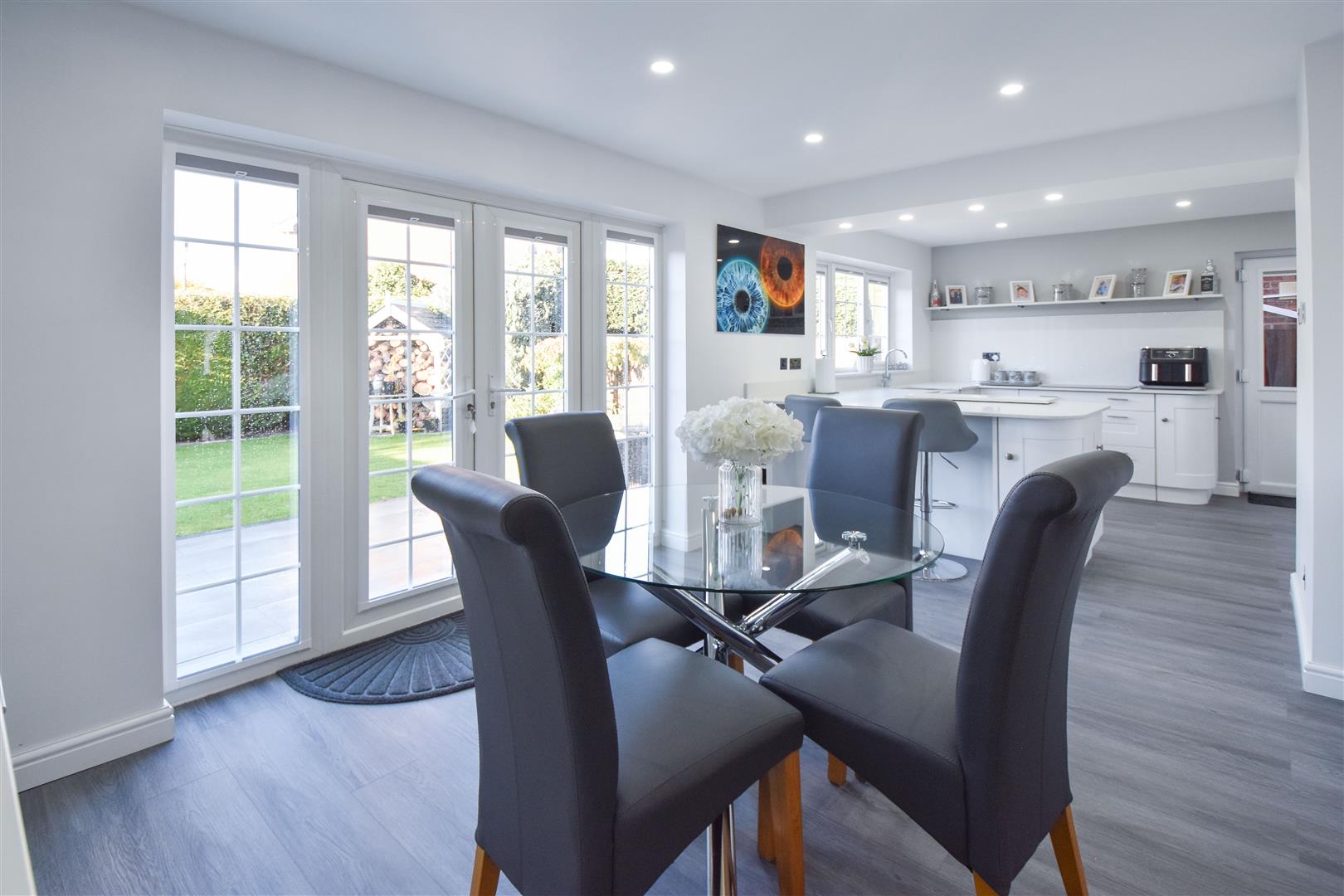 Kitchen / Diner - 6.86m x 4.17m (22'6 x 13'8) - French doors opening to garden. Kitchen area fitted in a range of white wall and base units with quartz work surface over. Peninsular breakfast bar with seating to one side. Integrated appliances to include: double oven, microwave and hob, fridge/freezer and dishwasher.