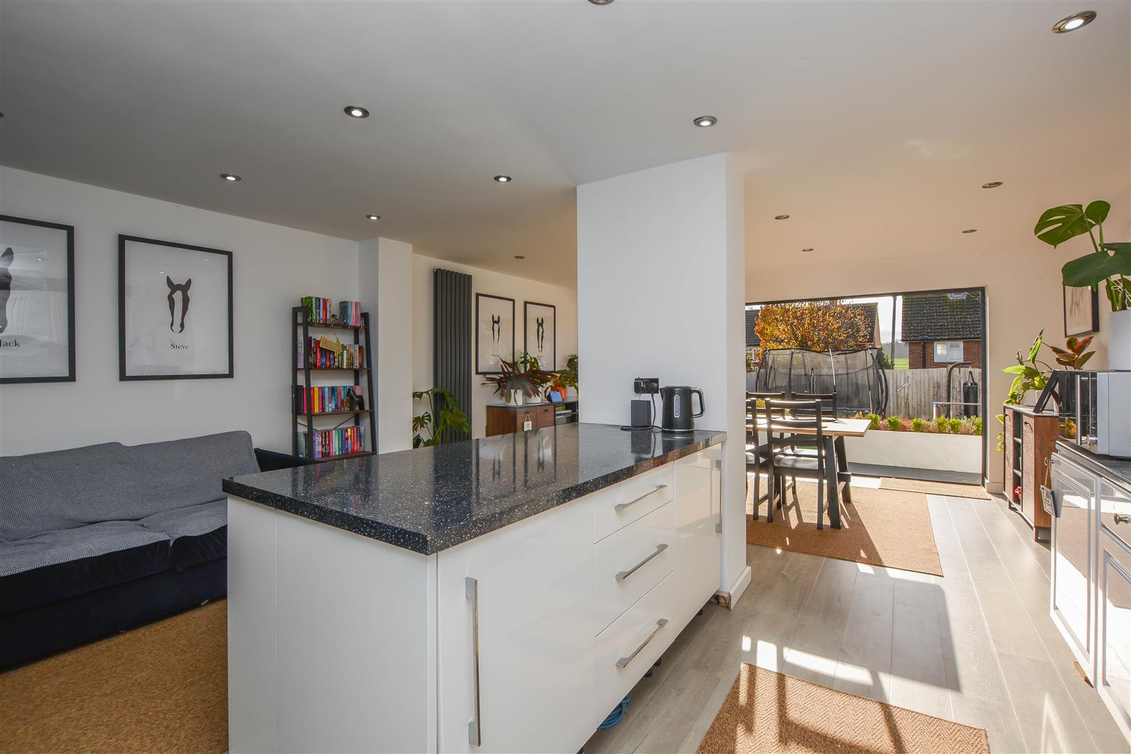 The internal layout begins with a welcoming entrance hall leading into a comfortable lounge, which flows seamlessly into an expansive open-plan kitchen and dining area. Forming the heart of the home, this impressive space is perfect for family living and entertaining alike, featuring a central island, a range of sleek eye and base level units, and generous worktop space. Full-width bi-folding doors open onto the landscaped rear garden, creating a wonderful sense of light and connection between indoor and outdoor living.