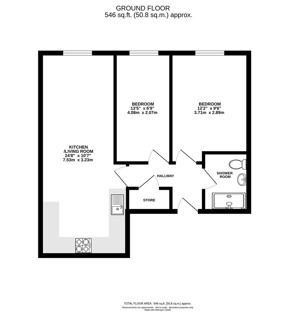The accommodation opens with a welcoming entrance hall featuring built-in storage and leads through to an open-plan kitchen, living and dining area, two bedrooms, and a contemporary shower room.