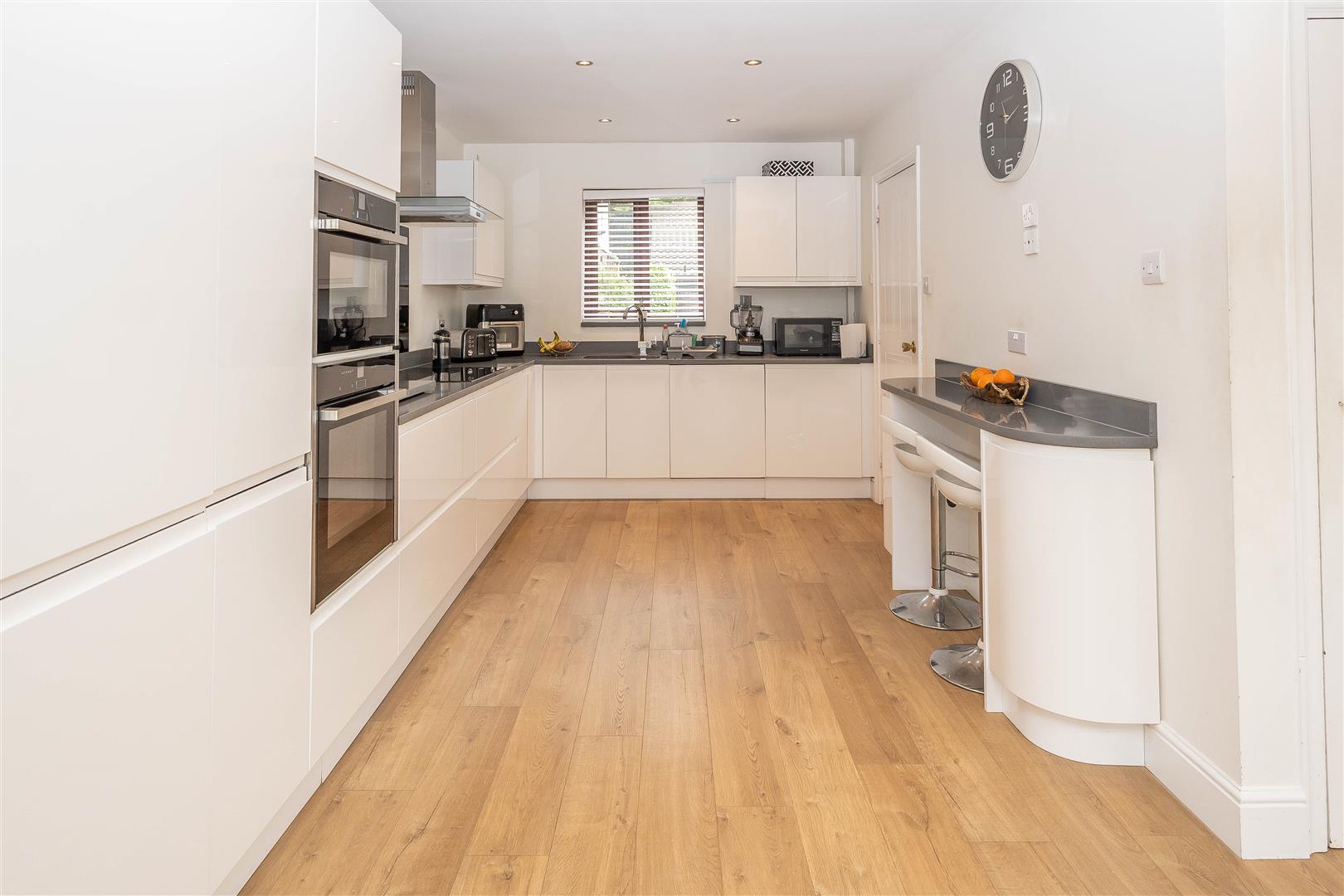 The internal layout begins with an entrance hall that leads into a bright, contemporary kitchen, thoughtfully designed with a range of eye and base level units, ample worktop space, and integrated appliances. The kitchen flows effortlessly into a spacious living room, an ideal setting for both daily life and entertaining, featuring dual windows and French doors that open onto the rear garden, allowing natural light to flood the space. Adjoining this is a generously sized sitting room, offering a flexible reception area perfect for relaxing. A convenient ground-floor WC completes the accommodation on this level.