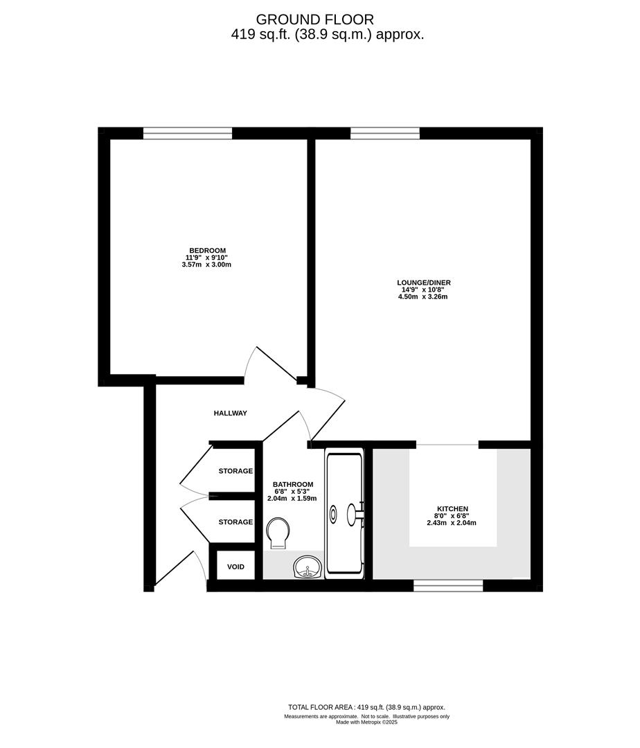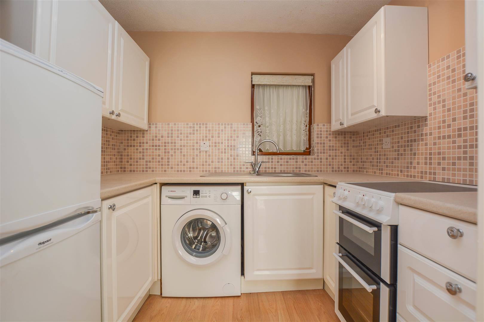 The welcoming entrance hall includes built-in storage and leads to a spacious lounge, which opens into a well-equipped kitchen fitted with eye and base level units and ample space for appliances. The property also features a stylish contemporary shower room and a generous double bedroom with built-in wardrobes.