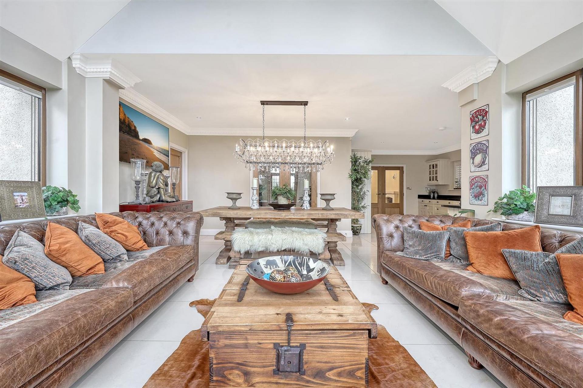 Approached by a private driveway with landscaped frontage and parking for numerous cars together with access to the attached garaging. Symmetrical in design the entrance hallway is double height allowing it to be both impressive and light filled with a recently fitted glass and oak staircase which mirror the new oak internal doors and classically inspired deep cornice. Double doors open into the Lounge with feature contemporary Ethanol fireplace and bay window overlooking the front elevation. To the opposing side of the hallway is the sitting room, again with oak double doors and a natural stone style fireplace and further double doors opening into the impressive kitchen/dining/family room. Having been fitted with an extensive range of bespoke built and designed kitchen cabinetry with complementary dark granite worksurfaces, range style oven, butler sink and leads round to the dining room with an amazing feature vaulted garden room with a fully glazed elevation and two sets of double doors onto the gardens. A wonderful room for both family living and indeed entertaining. The ground floor is completed by a good size laundry/utility room with door to the garden and a home office and ground floor cloakroom.