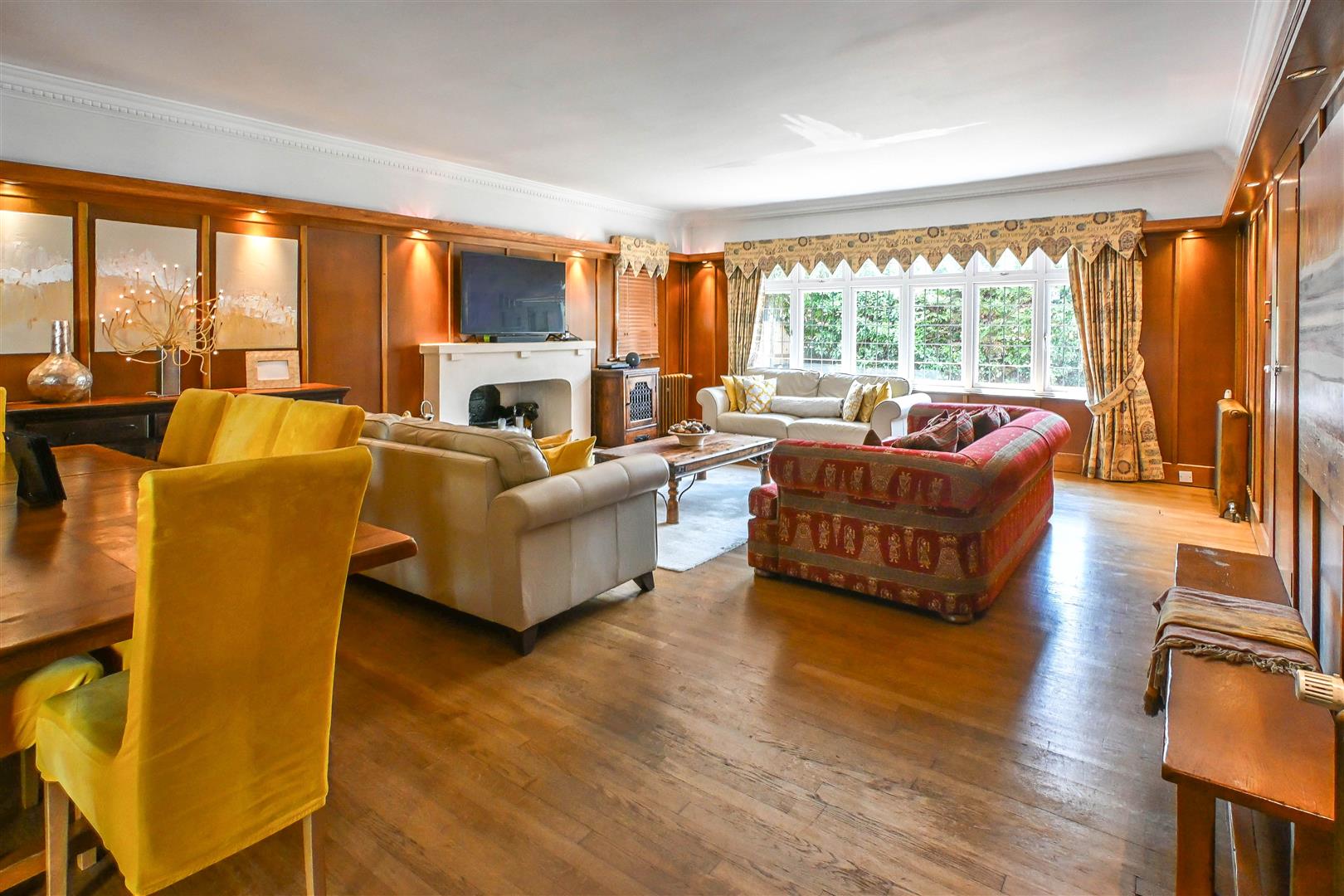 Internally, the property is generously proportioned and thoughtfully laid out, offering versatile living across two floors. The impressive entrance hallway flows into a series of elegant, interconnected spaces. At the heart of the home is the living room, featuring a beautiful purpose-built fireplace, offering a truly magnificent setting for both formal gatherings and relaxed evenings The adjoining garden room provides a serene, light-filled retreat with French doors opening out to the garden. Expansive windows allow natural light to flood the interior, creating a bright and uplifting ambience throughout the home.