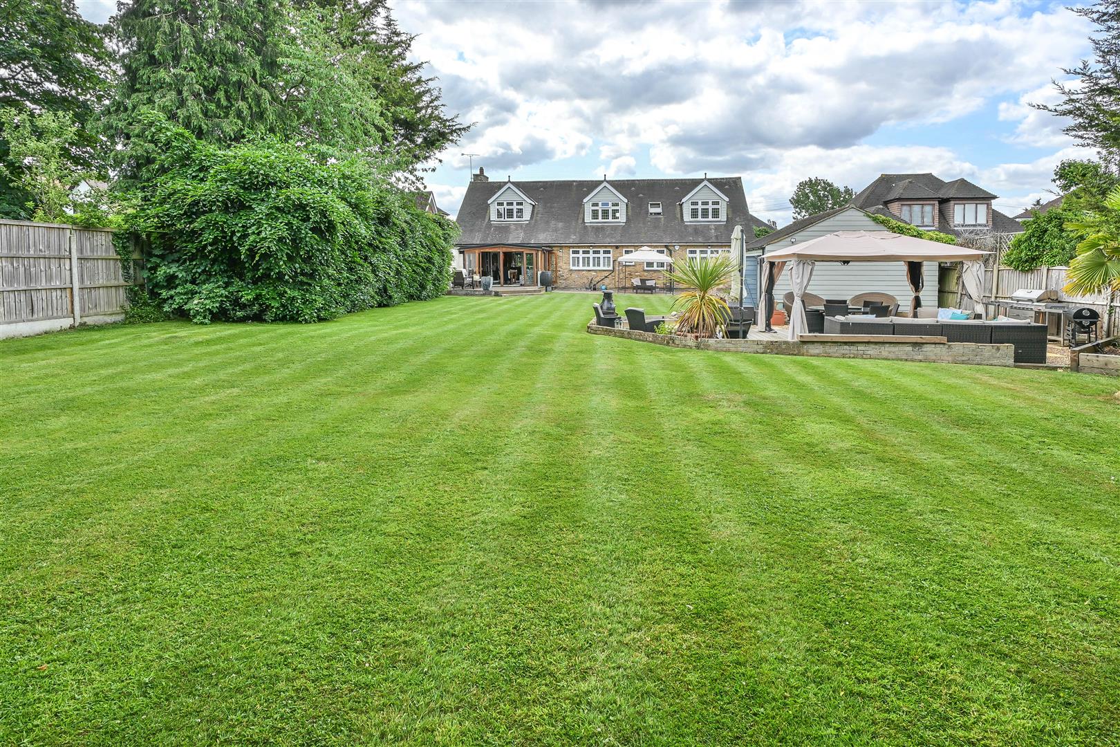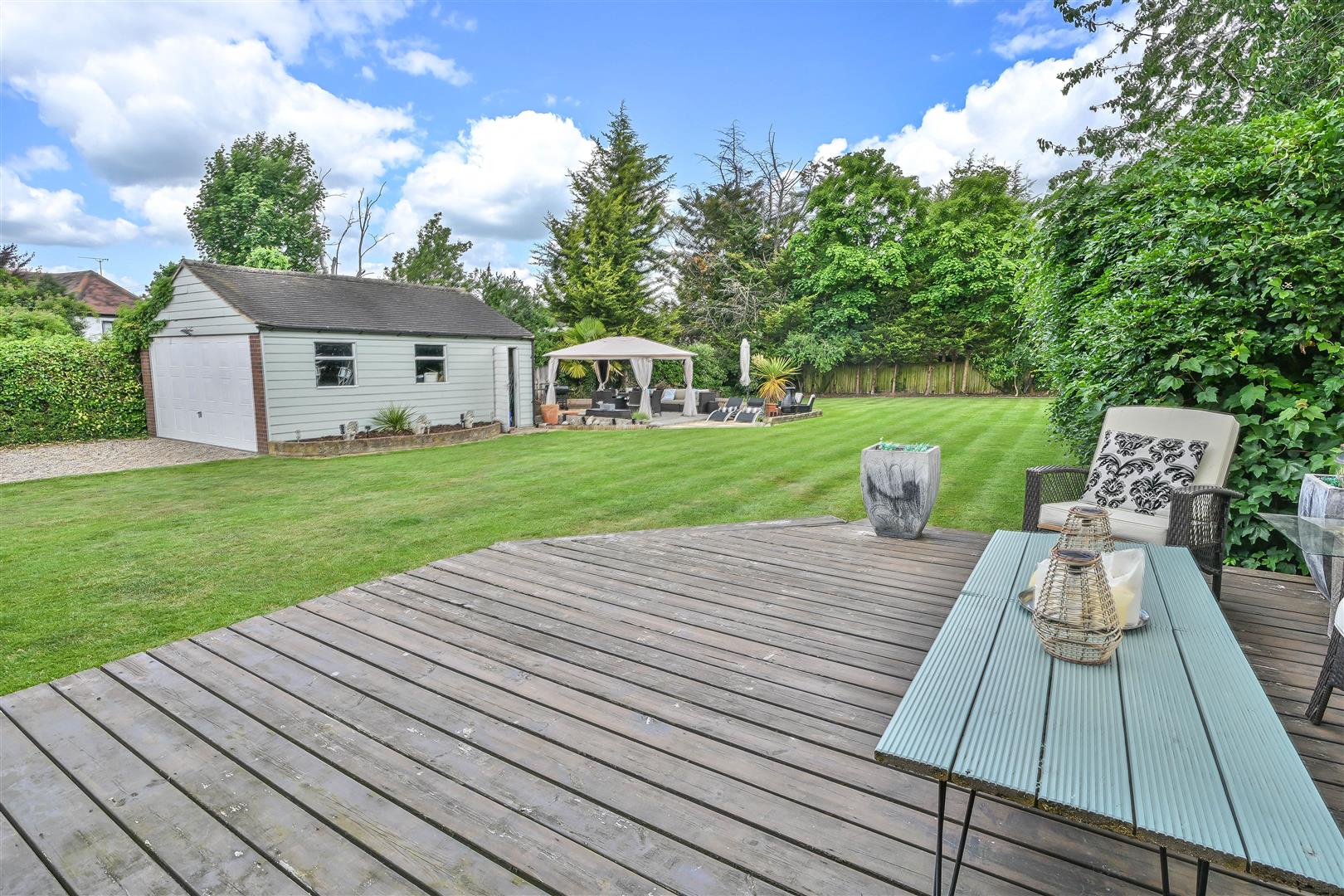 Externally, the property is approached via a sweeping gravel driveway that leads to a substantial detached double garage (20'0" x 16'0"), offering generous off-street parking and versatile storage options. The rear garden mirrors the meticulous care of the front, unfolding into an elegant outdoor haven. Three distinct entertaining terraces provide idyllic settings for hosting guests or indulging in alfresco dining. Beyond, an immaculately manicured lawn is framed by mature, professionally landscaped borders, delivering both privacy and year-round visual appeal.