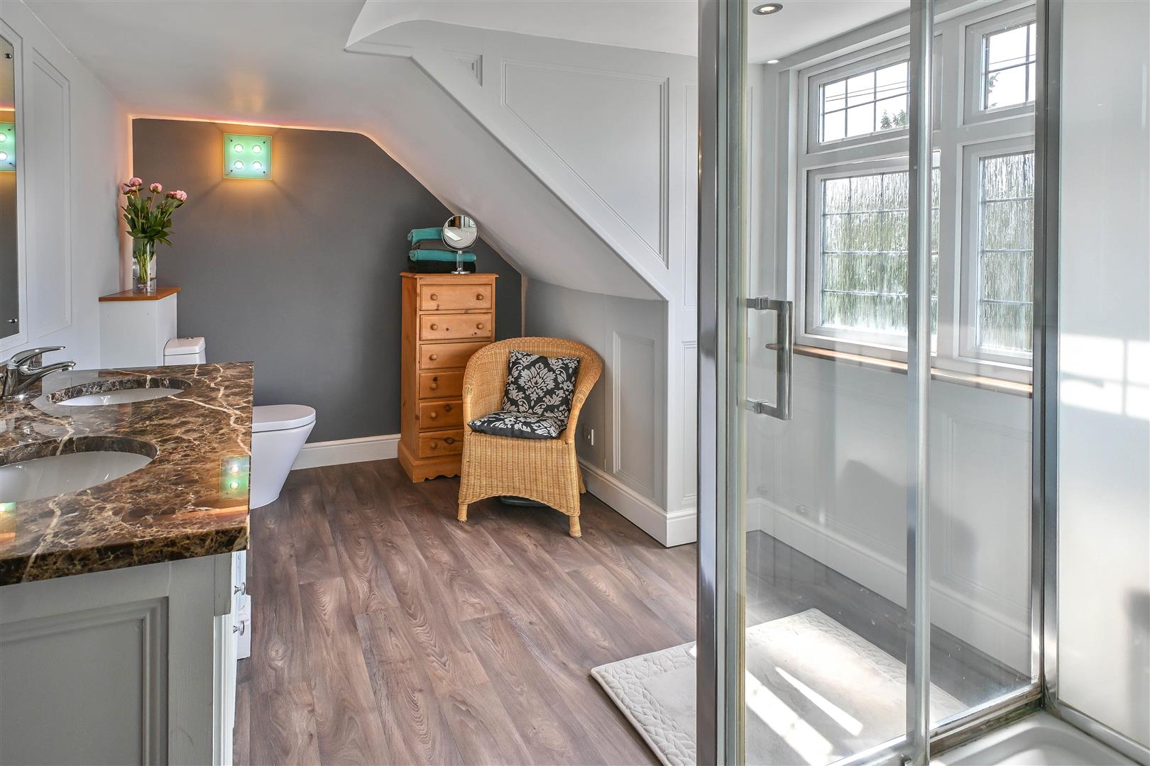Rising to the first floor, the upper floor houses a further three bedrooms, including the luxurious 17'10" x 12'10" principal suite - a sanctuary of comfort with fitted wardrobes and a sumptuous shower room. Two additional bedrooms share access to another modern shower room and enjoy charming views over the landscaped surroundings. A large landing with eaves storage and a quiet separation between rooms enhances the sense of privacy and peace throughout this level.
