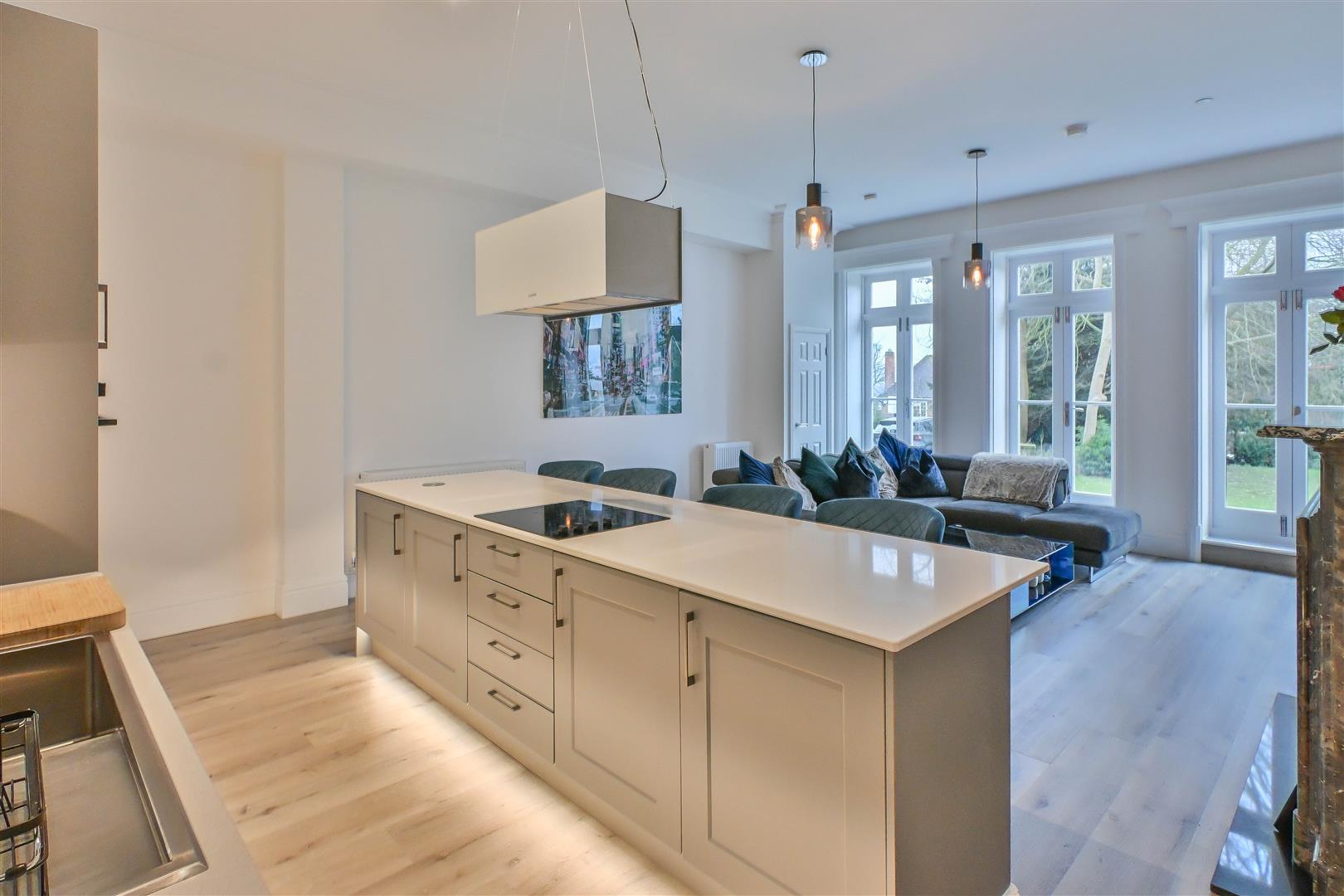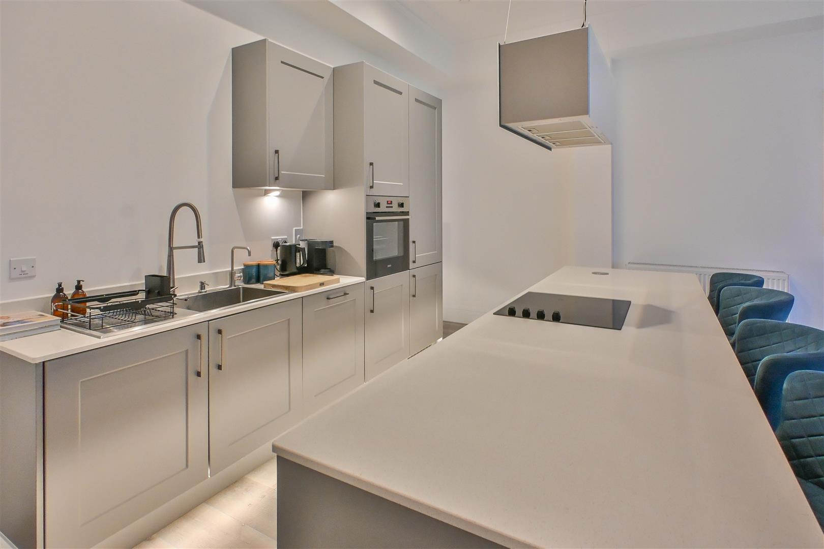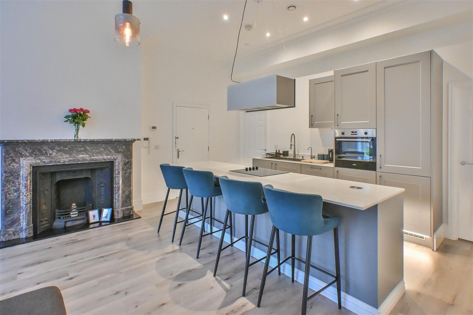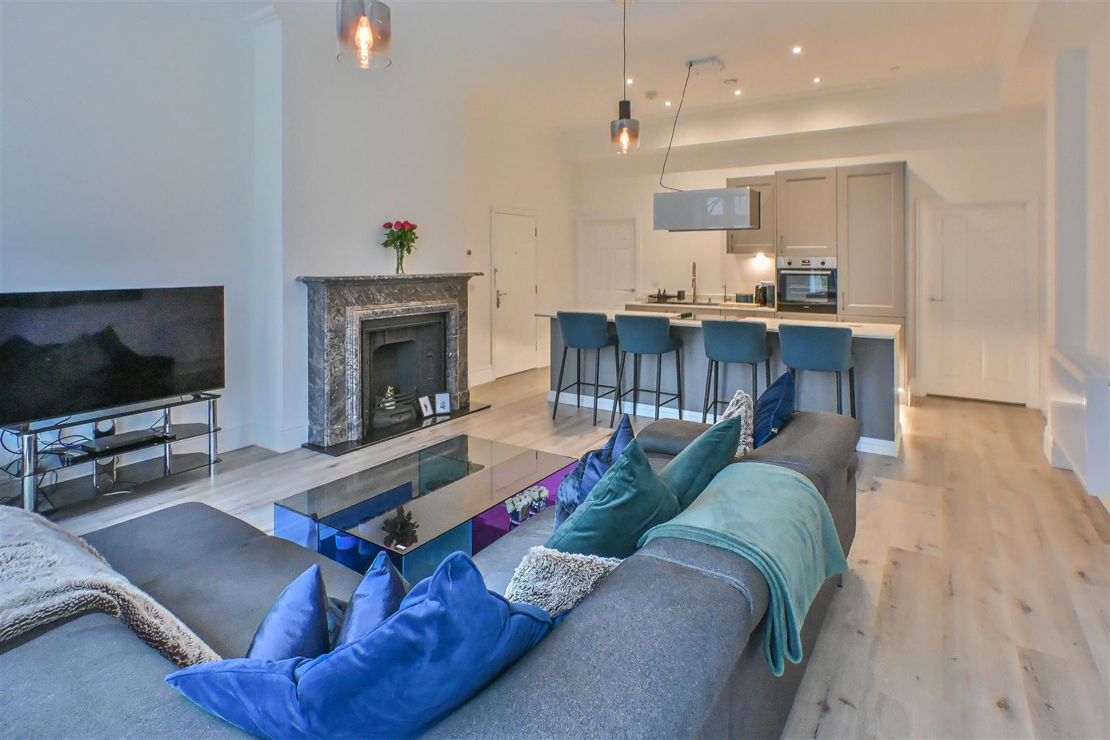 The accommodation is introduced by an impressive and light-filled reception room, featuring three sets of French doors that open onto and overlook the beautifully maintained gardens. This elegant space incorporates a comfortable lounge area with feature fireplace, alongside a sleek, fully fitted kitchen complete with integrated appliances and a breakfast bar.
