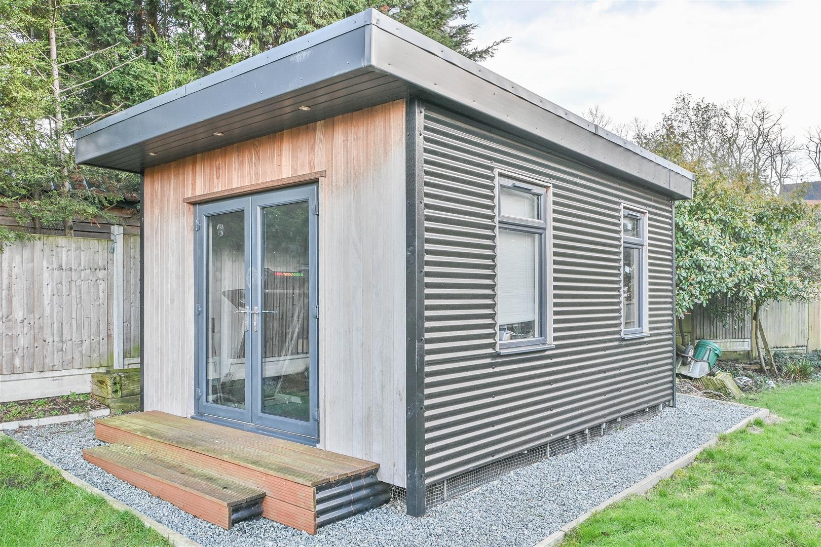 Externally, the generous rear garden begins with a paved patio area, extending onto a well-maintained lawn bordered by mature shrubs. A purpose-built garden room offers an ideal space for a home office or gym. To the front, a driveway provides off-street parking, while to the side of the property is a garage with an up-and-over door.