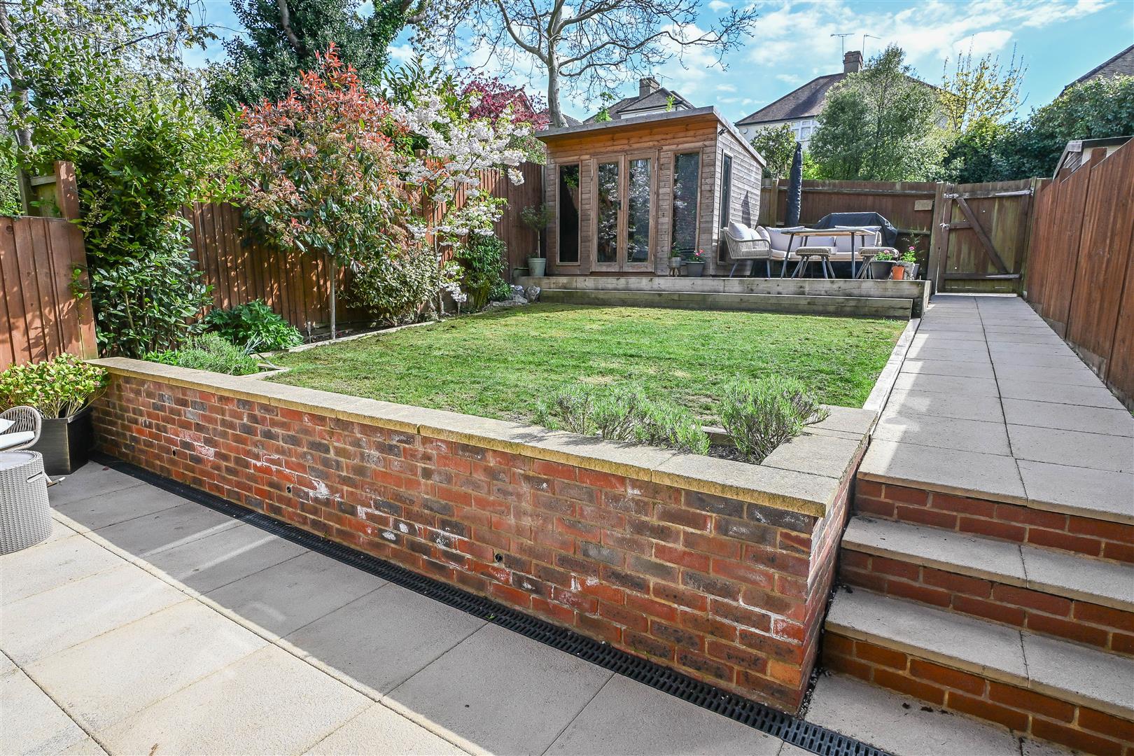 Outside, the rear garden features a paved patio that leads to a neatly maintained lawn bordered by mature shrubs-creating a tranquil outdoor space. Toward the rear, a summer house sits beside a decked seating area, ideal for relaxation or entertaining. A rear gate provides direct access to a private car park with two allocated parking spaces.