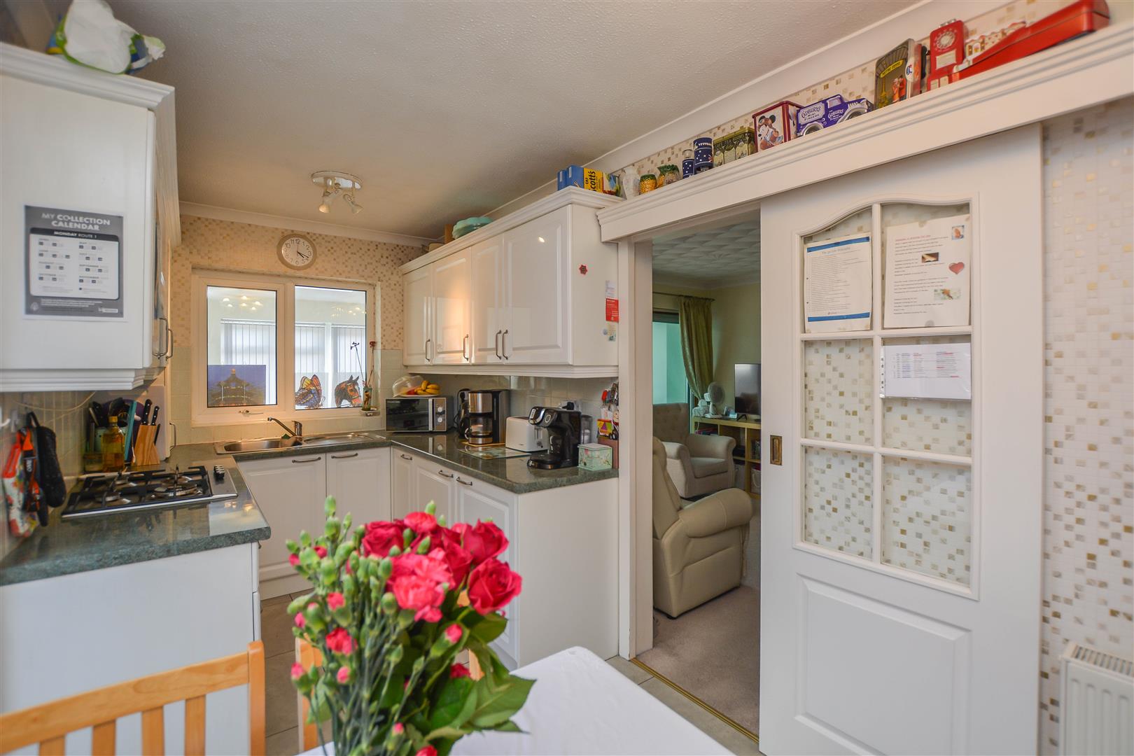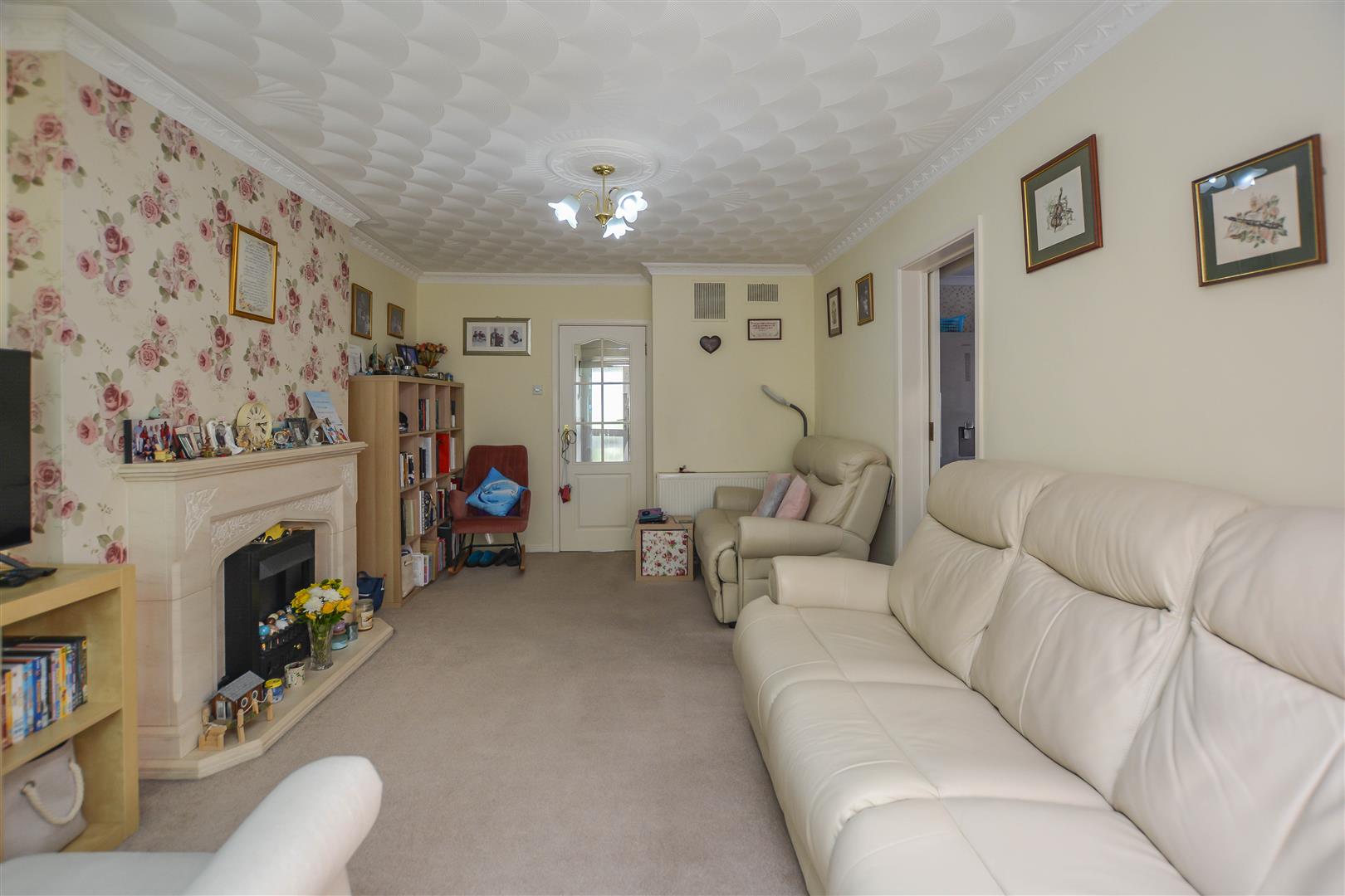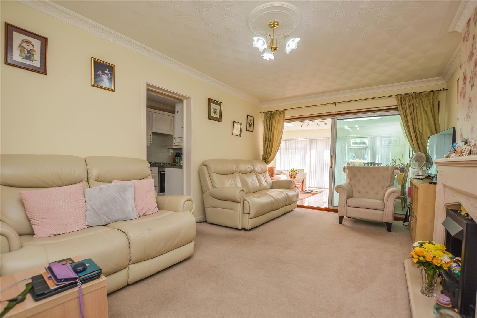 The internal layout commences with a porch that opens into a spacious entrance hall, complete with built-in storage and access to a ground floor WC. At the front of the home, the former garage has been thoughtfully converted into a flexible family room-ideal for use as a playroom, home office, or snug. To the rear, a comfortable lounge offers a relaxing retreat and flows seamlessly into a further reception room through large sliding doors. This bright versatile space provides a charming setting for dining and everyday living, with French doors opening out to the rear garden. The well-appointed kitchen features a range of eye and base level units and leads to a side passageway, providing additional access to a practical utility room.