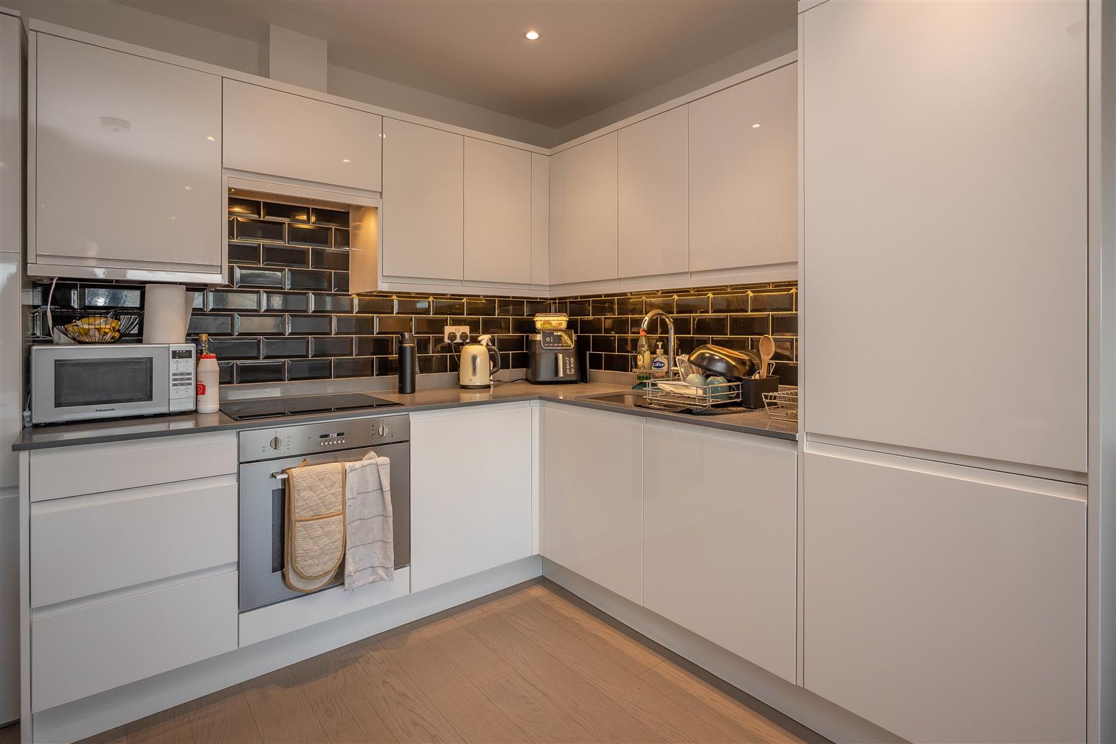 The property features well-designed accommodation introduced by a welcoming entrance hall giving access to all rooms. At its heart is a bright, open-plan living area with a sleek contemporary kitchen fitted with modern units and integrated appliances. Two well-proportioned bedrooms provide comfortable living space, with the principal room enjoying a large window that frames attractive views of the surrounding greenery. A modern, well-appointed bathroom completes the accommodation.