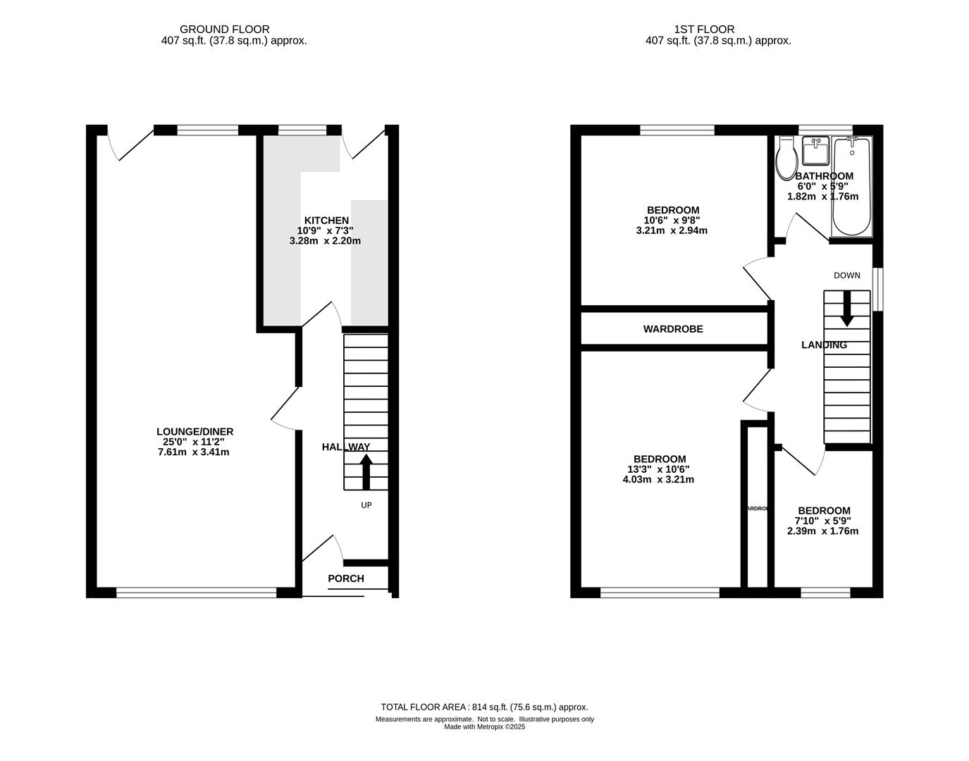 Upstairs, the landing provides access to all rooms. Two well-proportioned double bedrooms benefit from fitted wardrobes, while a comfortable single bedroom and a family bathroom complete the first floor.