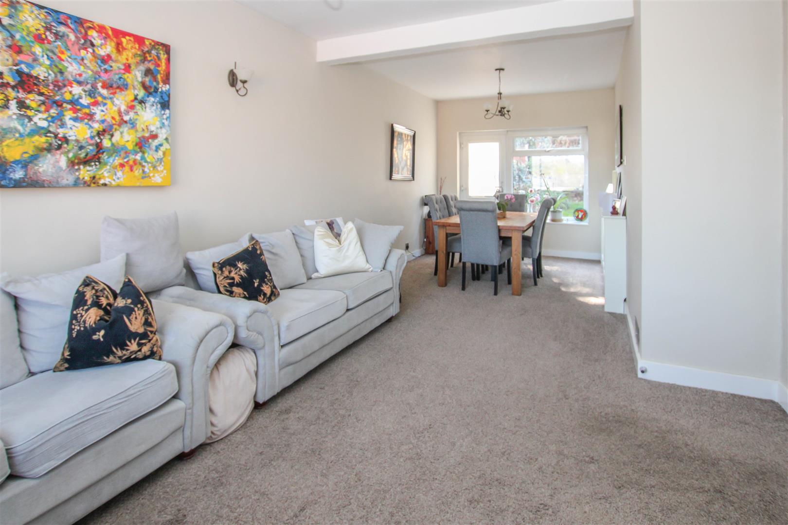 The property's internal layout begins with a practical porch, opening into a welcoming entrance hall. From here, you're led into a bright and spacious open-plan lounge and dining area, filled with natural light thanks to a large front-facing window and additional rear window and door overlooking the garden. The well-appointed kitchen features a range of eye and base level units, generous worktop space, and direct access to the rear garden.