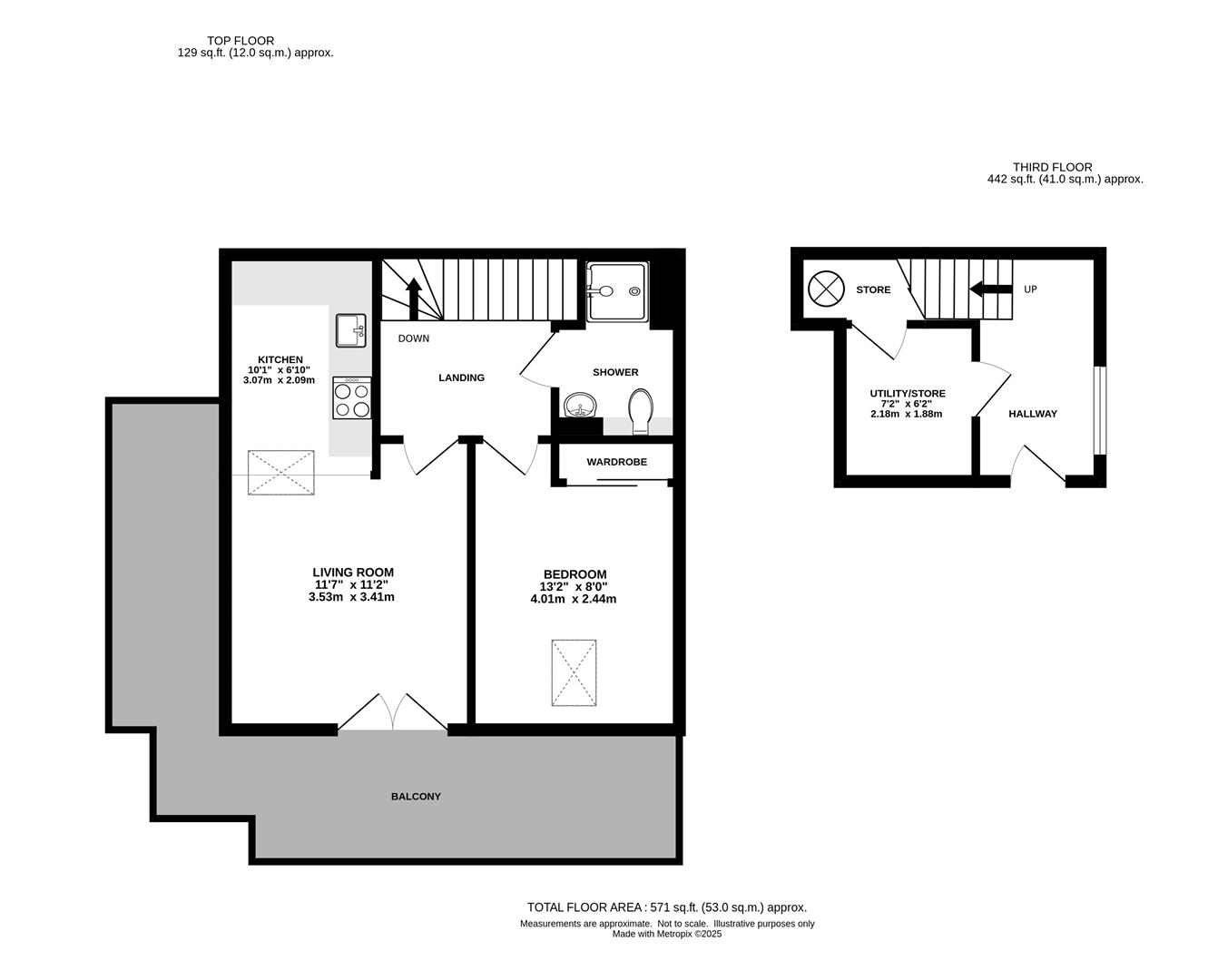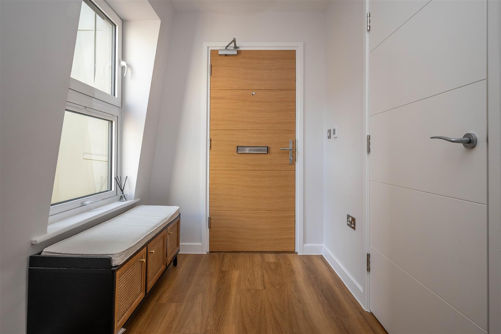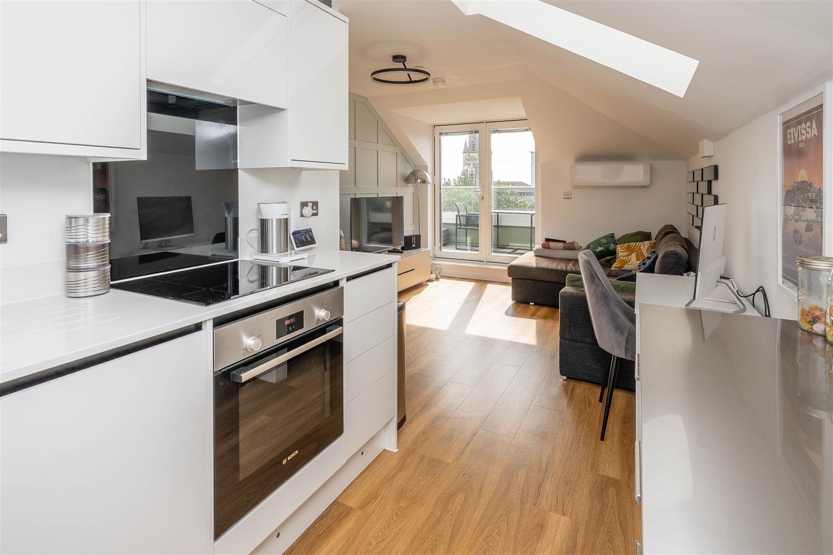 Beautifully maintained, the accommodation begins with a welcoming entrance hall, offering access to a large and practical utility/storage room - a feature rarely afforded within a one-bedroom apartment - alongside stairs rising to the main living space. The bright and inviting living room flows effortlessly into a modern, well-equipped kitchen, complete with built-in Bosch appliances, sleek eye and base-level units, and granite worktops. Two installed air-conditioning units and underfloor heating ensure year-round comfort. French doors from the living area open onto a spacious wrap-around terrace, the perfect retreat to relax and enjoy breathtaking views across the complete London skyline, with spectacular sunsets in tow. The property offers a generously sized double bedroom with fitted wardrobes, complemented by a stylish contemporary shower room.