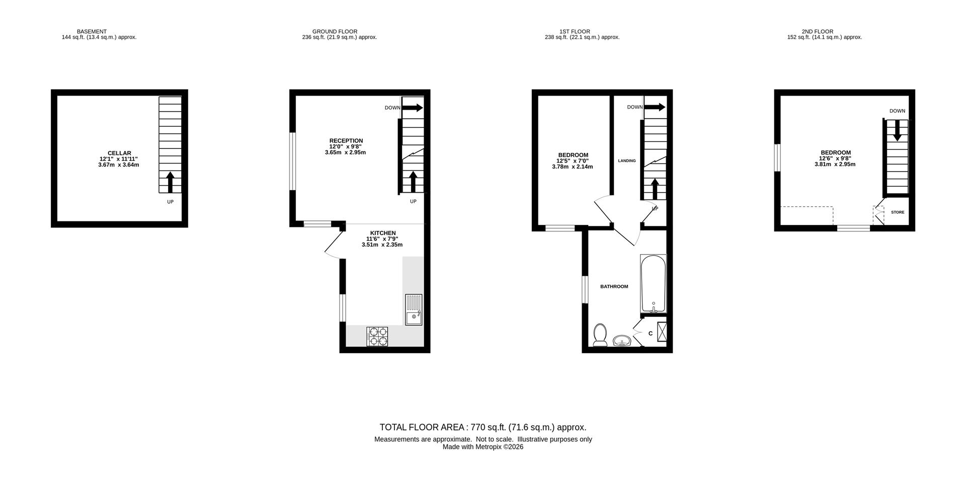 Arranged over four floors, this home offers well-balanced and versatile accommodation, including an open-plan kitchen and living area ideal for modern living, two well-proportioned bedrooms, a contemporary bathroom and a useful cellar room providing flexible additional space.