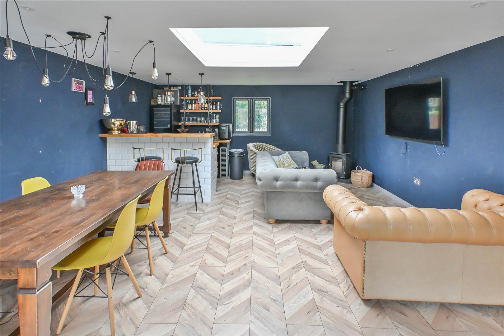 Outside, the rear garden begins with a paved seating area, perfect for al fresco dining, which extends to a neatly maintained lawn framed by mature shrubs. A purpose-built outbuilding adds excellent versatility, currently arranged as a bar and living area with its own wood burner. To the front of the property, a large block-paved driveway provides ample off-street parking.