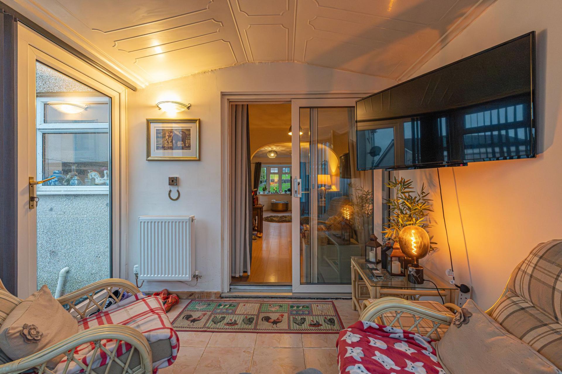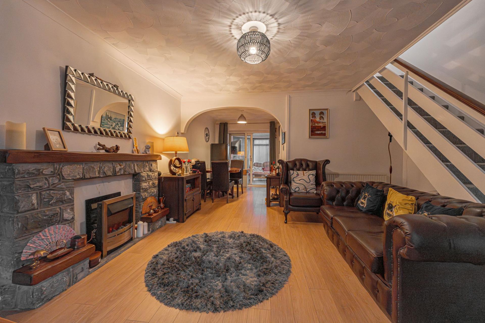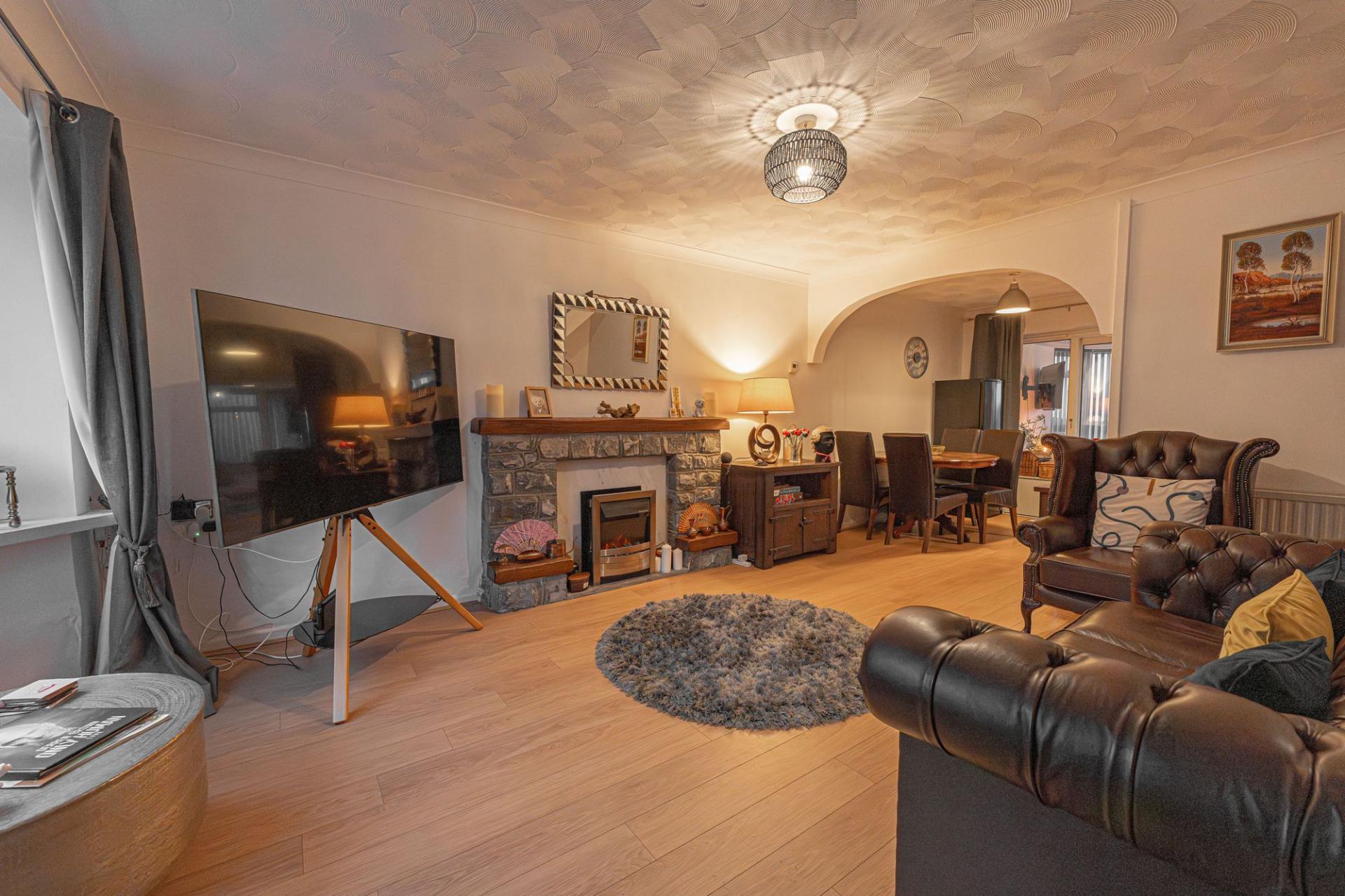 This well presented family home welcomes us in to an impressively sized reception room, which boasts an fluid open plan design blending the lounge and dining area. This spacious room is enhanced by a large bay window that lights up the room, and a stone fireplace that adds to the warm and inviting atmosphere, perfect for entertaining guests and unwinding at the end of a long day. The stylish kitchen is fitted with multiple cabinets for easy storage, and offers plenty of space for appliances to join the fitted hob and oven. At the rear of the house we can find sliding doors to the charming conservatory, providing another bright lounge space that adds to the flexibility of the home.